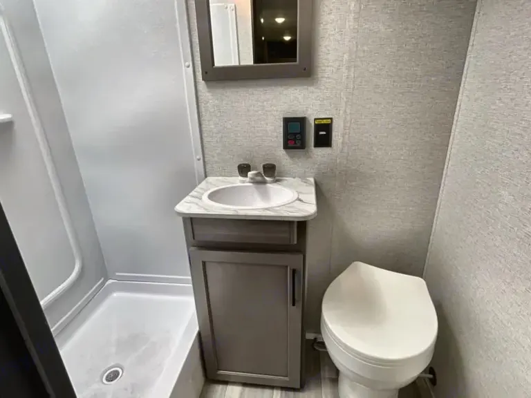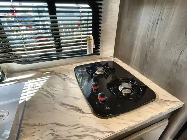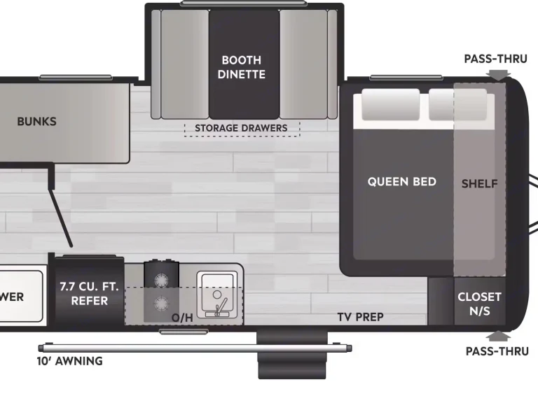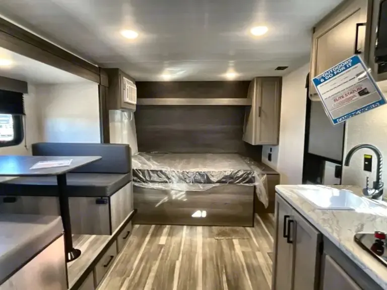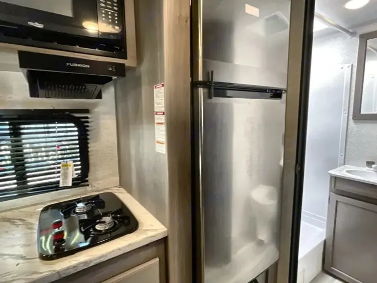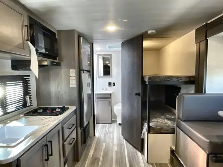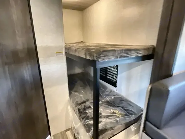 Sweet little camper with everything you need to enjoy the outdoors in absolute comfort. Upgrades to full mattress and top bunk to allow comfort and access. Storage available above the bed, in the closet and under the bed to ensure you have the most space to enjoy your time while inside. Endless water heater ensures a comfortable shower if you need it!What's included• Coffee maker