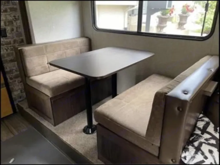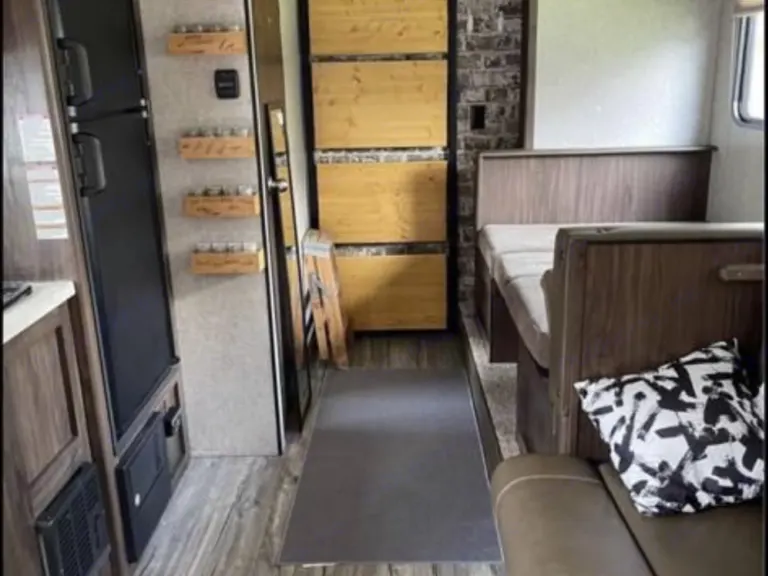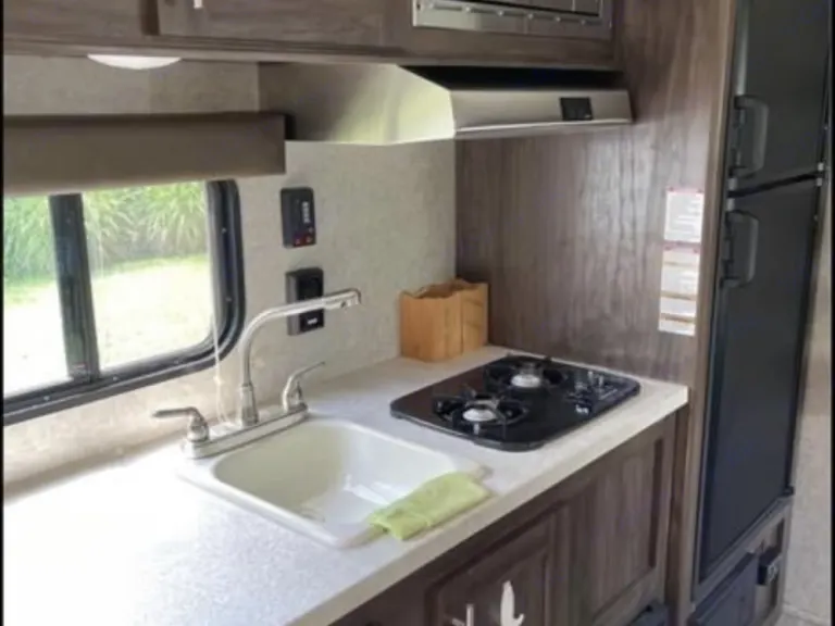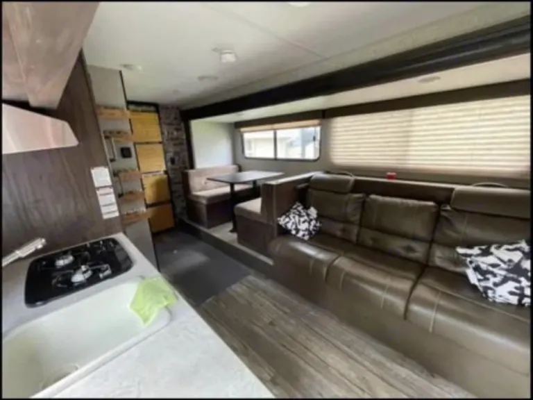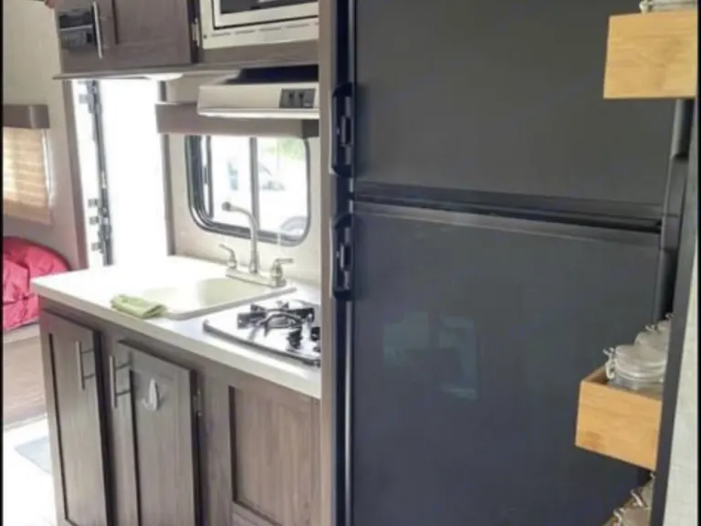 It’s perfect for beginners easy to tow and have everything you need. It come with a stove, microwave, full fridge, mini chimney and shower bathroom, and much more . This puppy is ready for new adventures.