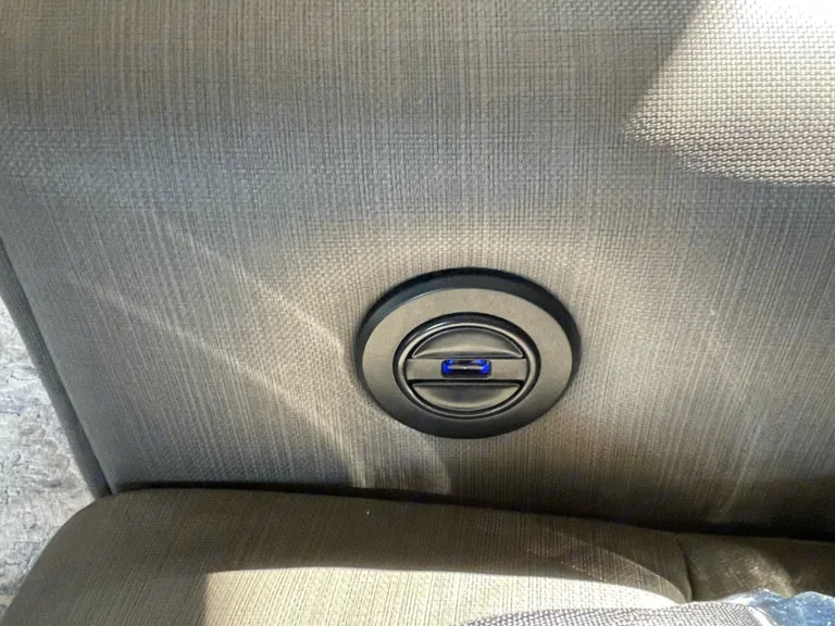 Built-in electric fireplace with fun hidden lighting throughout the motor home to give it that at home feel.