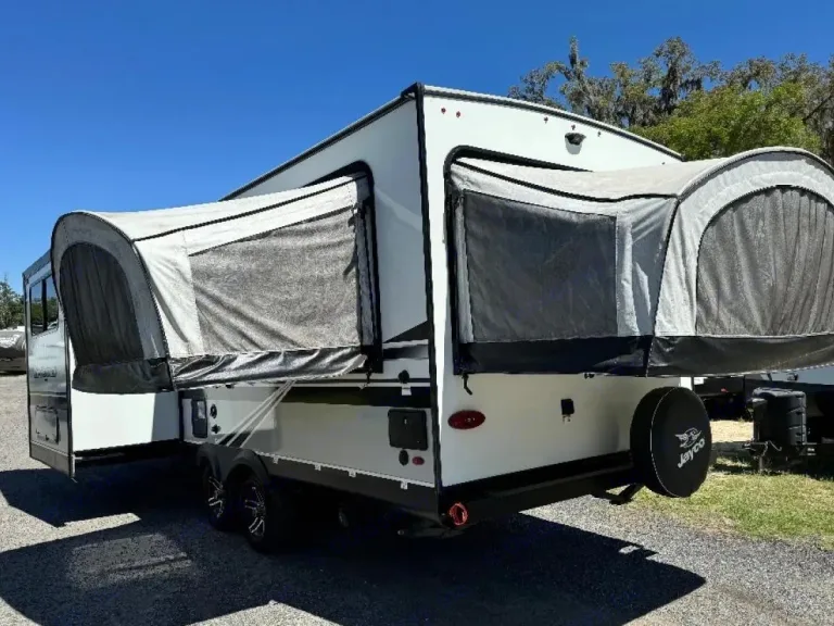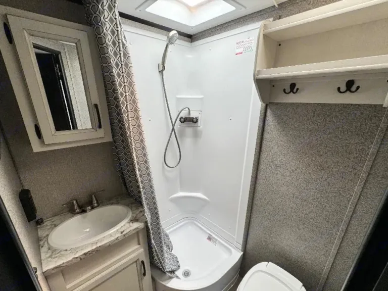 - Power awning, propane furnace, ceiling fan, and air conditioning