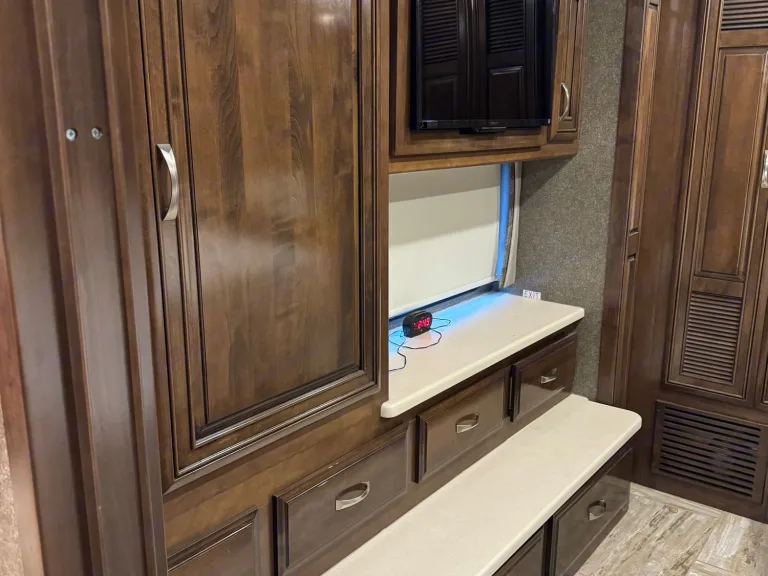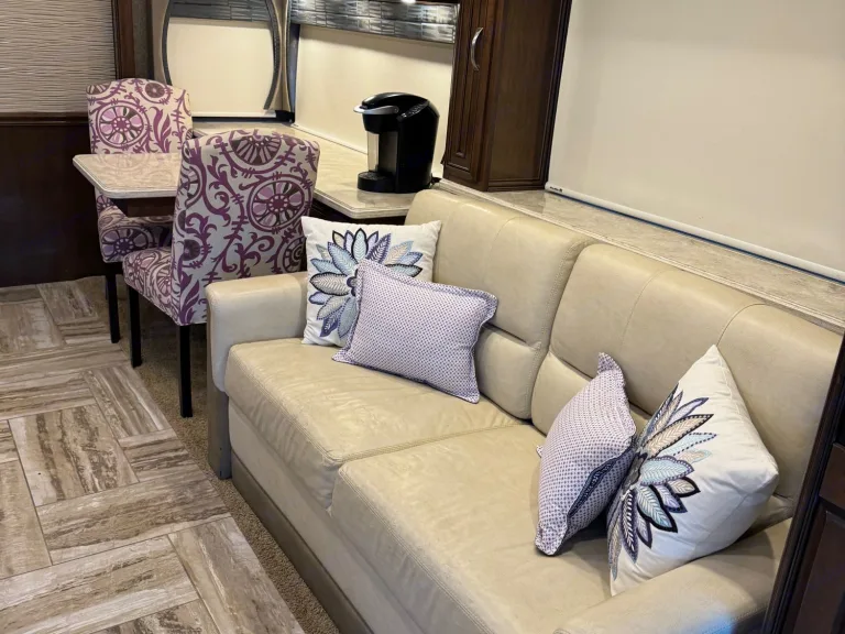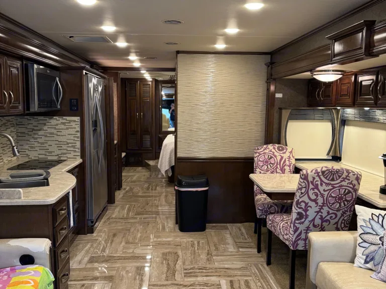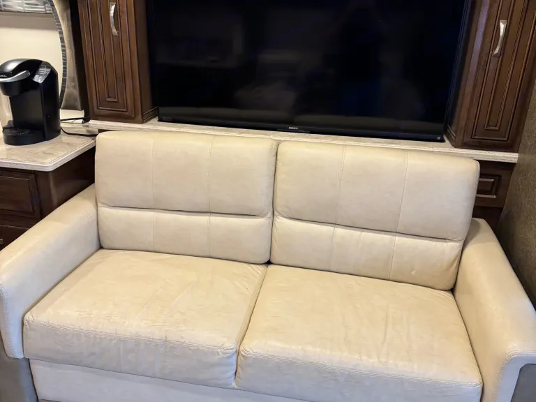 Please ensure your site can accommodate a 40-foot RV with full hookups before booking.2017 class A motorcoach is fully equipped with lot of sleeping space. The master is equipped with a King size bed, while the living area includes a couch with a pull-out air mattress full bed. There is also a full bed over the cab. The kitchen has an induction oven, microwave, ventilation vent. Storage will not be a problem with outdoor storage space underneath for all your adventure gear!