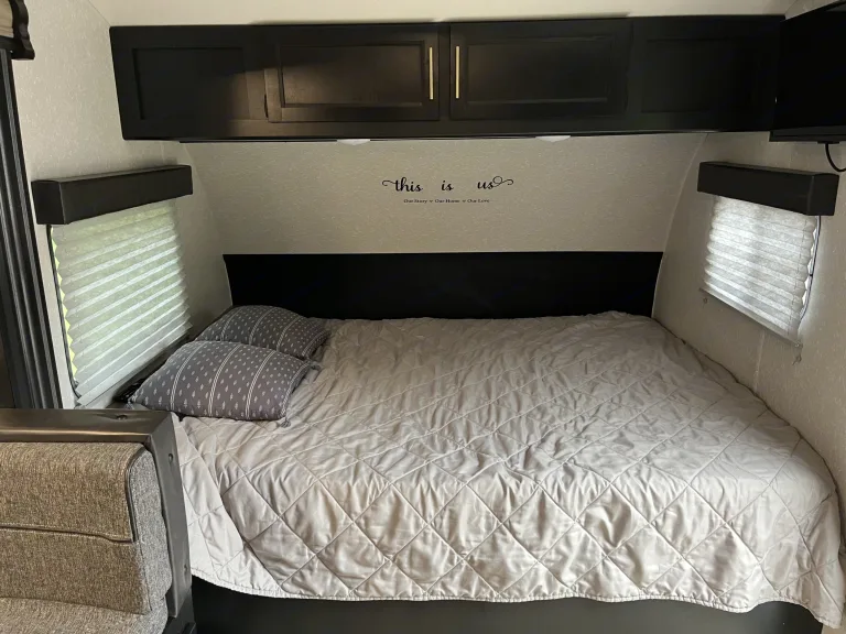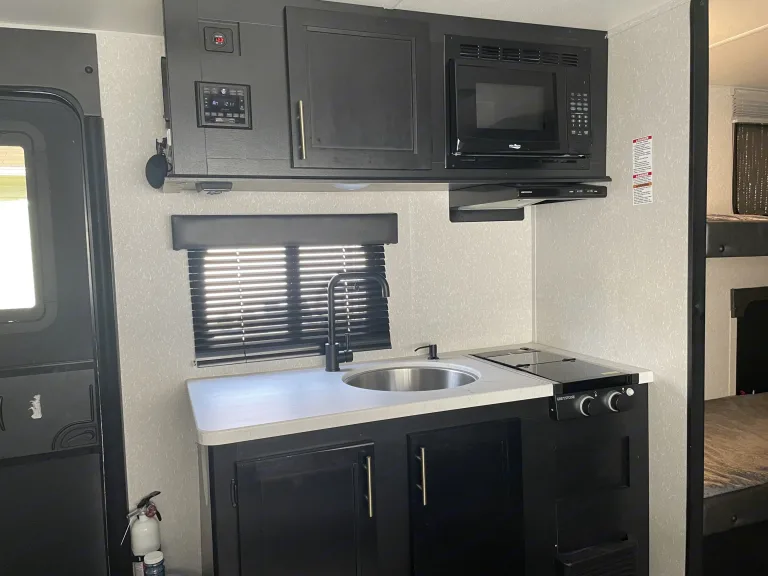 Cozy bunkhouse with all the basics, enjoy a weekend getaway or a fun road trip with friends, family or just you and your furry ones, this trailer comes ready for anything. Can sleep comfortably 2 adults and up to 3 children with the breakdown dinning table that converts to a bed.Setup camp effortlessly with a powered lift jack, back up that trailer safety with a back up camera and rear view mirror mounted display.Stock the outdoor fridge with your favorite drink, roll down the owning and just relax. Everything that you need comes with the camper well organized in plastic boxes for stress a free experience.The trailer has also an outdoor shower to washup after a long hike or hot day at the lake or beach. You can also carry your own on stuff in the rear rack that holds up to 100lbs..No smoking please