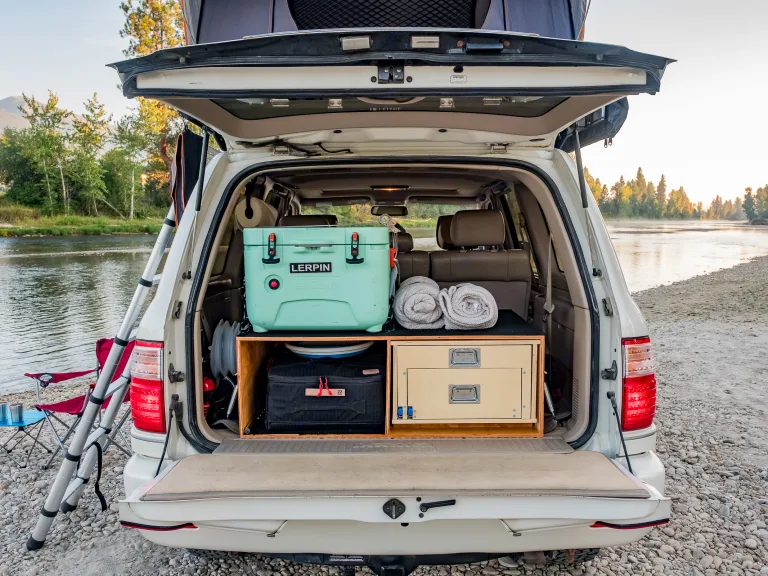 She’s outfitted with a Roof Nest rooftop tent - wedge style, so it’s quick to set up and put away. The tent has an Xped-style inflatable foam and air mattress for superior comfort with sheets and a comforter up there. There are also two pillows included. There is also a CVT awning, just remember to peg and guy it down or it can get away from you in the wind. For your cooking needs, we have installed a new drawer kitchen slide-out setup. We have outfitted you with a mess kit with a stove, cooking utensils, extra prep space, and everything to enhance your culinary creations. And there is nothing more frustrating than cooking in the dark, so we included food prep lights that attach to the hatch for those nights when you roll into camp late. We also have two charis, A Cooler, Hammock, and tree straps, a small table, card games, and most everything else you would need for your adventure. Just bring your clothes, fill the cooler, and you're off.Off-road comfort and capability are extremely important in an overland expedition vehicle, and she’s not lacking in any of those areas. Equipped with rugged All-terrain tires, adjustable suspension, full-time all-wheel drive, body armor, ditch lights to help spot those deer as the sun goes down, and much more. She’s ready to road trip through the national parks and explore off-the-beaten path in search of those perfect sunset spots.What's includedFor your comfort we Include: