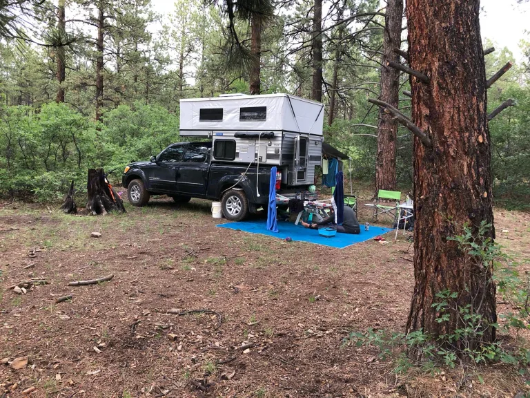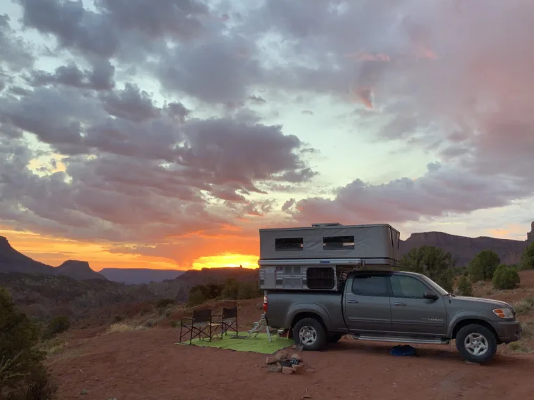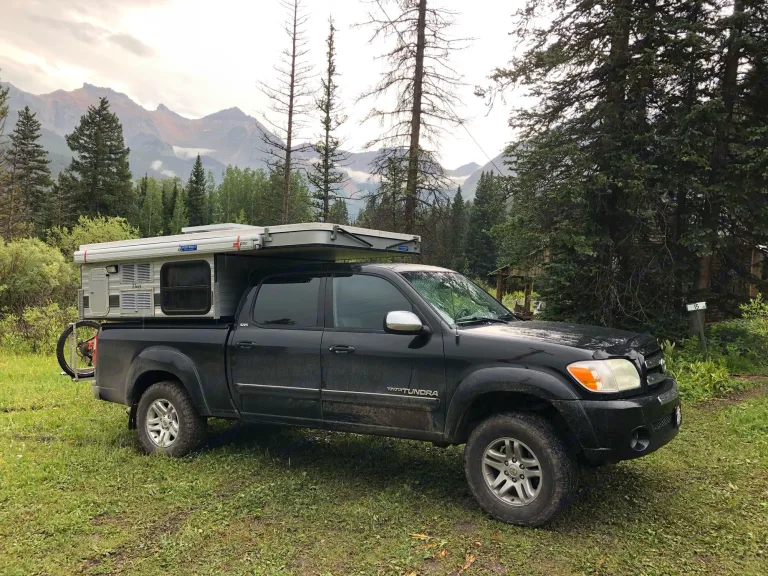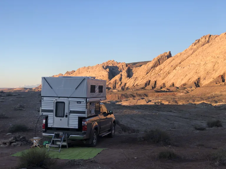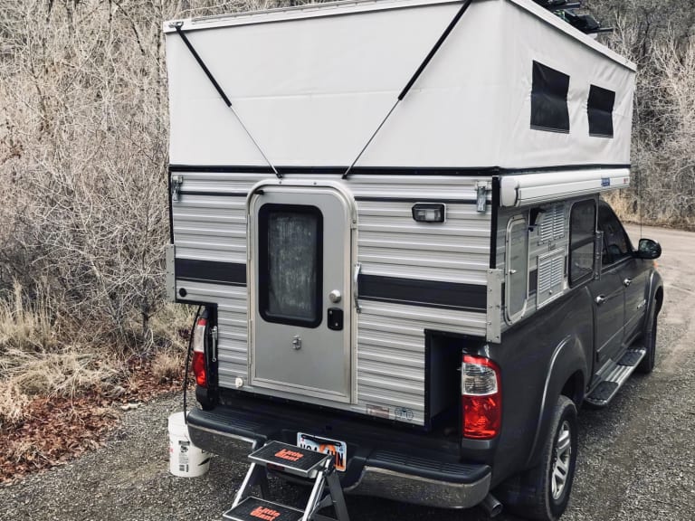 Alpha Adventure RIG. Self reliant and capable of getting you away from the crowds. 4x4 Toyota Tundra crew cab with a Four Wheel Camper Silver Spur Fleet Model pop up camper. Light weight and ultra mobile, this rig is super fun, as you can take it off of the beaten path. Get out and explore the depths of the wilderness, National Parks, National Forests and more.....Engage in our add-ons and tailor your adventure to your liking with a bike rack, cargo rack, or roof racks.Enjoy a great nights sleep in the plush bed that’s bigger than a queen but not quite a king and can be stowed away to access the comfortable two person dinette.Keep a nice supple of fresh food in the 80L fridge that runs off of a solar powered battery pack. Extend your outing for longer than 3 days with the rental of one of our yeti coolers to accommodate additional fresh food.Enjoy a rinse off with the outdoor hot shower.Fill the ample storage with supplies to keep you satiated in the backcountry. And enjoy the full size back seat in the truck for additional passengers or gear.The Fiama side awning offers shelter from the elements, while still enjoying the great outdoors.The sand rug that’s included minimizes dust and dirt around the door and offers a barefoot friendly outside hangout area with the complimentary director style camp chairs.The optional rental of our toilet system allows for primitive camping. It’s an aluminum box with a toilet seat and a hand washing system (most commonly known as a river toilet or groover). Clean out included in the rental fee.What's includedEquipped with a 26-gallon water tank, hot water heater, outdoor shower, sink, 85L fridge, two-burner stove, furnace, king size bed, 2 person dinette, cookware and utensils, fresh bedding, and towels.