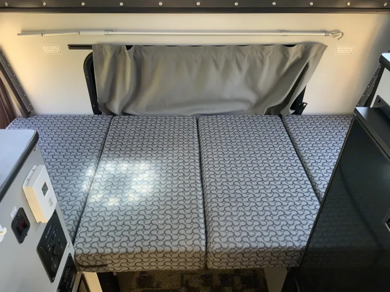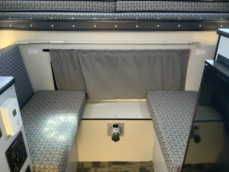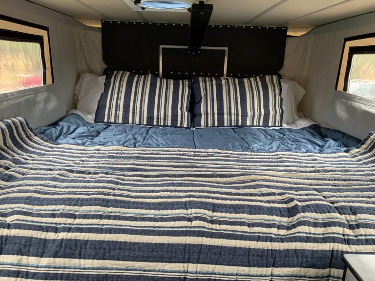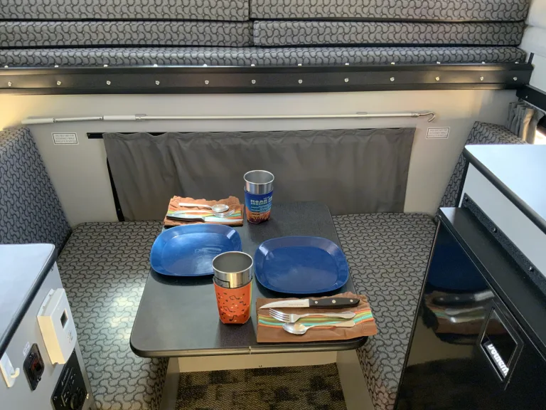 The entire camper and truck cab are sanitized with a SmartUV sterilizer and an ozone machine.This rig accommodates two adults and a smaller person inside the camper (the dinette converts into a twin size bed).