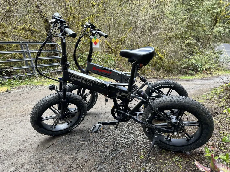 Two fat wheel electric bikes with locks, lights, horn and carrier packs.