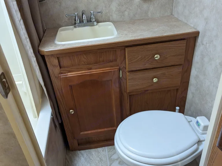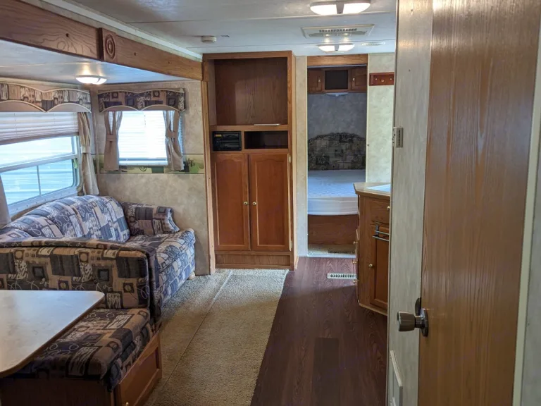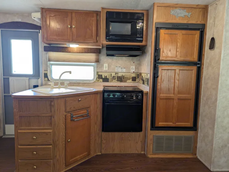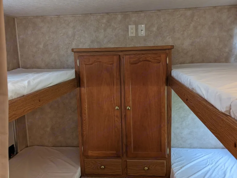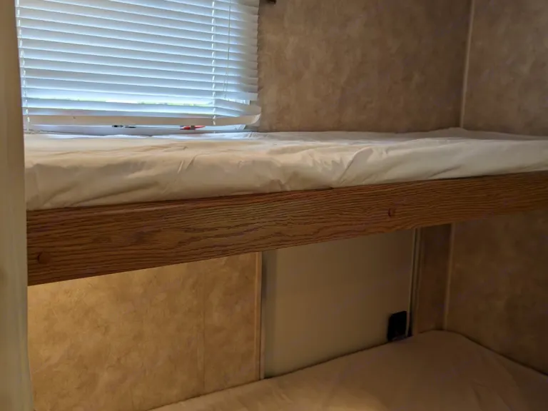 Welcome to your next adventure!Upon entering the camper, you will be welcomed with a spacious layout. The kitchen features a fridge, double sink, oven/range, microwave, several cupboards and drawers and a built-in paper towel holder. There is also a nice sized pantry to keep all of your vacation food. The fold-out couch, as well as the collapsible dinette, double as sleeping areas. The seats of the dinette lift to reveal more storage. The many windows let in lots of natural light as well as letting the breeze flow through when opened. Several ducts will keep you comfortable with air conditioning or heat.The bathroom consists of a shower (with hand-held wand), tub, sink with vanity drawers and storage, a foot-flush toilet and medicine cabinet/mirror. A skylight keeps the room very bright.The bunkroom boasts a whopping 4 bunkbeds and a wardrobe with lots of storage! Two small kids may even share a bunk! Vents keep the room just the right temperature. A curtain separates the bunkroom from the living areas.In the master, a queen bed, double wardrobes and double side tables with drawers provide a lot of storage! The platform of the bed raises to reveal another storage area. Store your luggage or laundry basket there to keep your floors clear. Two windows bring in the natural light as well as the breeze when needed. More vents keep the room comfortable. The master bedroom has a sliding door for extra privacy.Outside, the large awning is great for relaxing in the shade. Do NOT leave it out unattended or during rain and wind. On both ends of the camper are storage compartments accessible by either side. Hoses, as well as gear needed for set-up and tear-down are found there. There is also an outdoor shower.We truly hope you have a great vacation with many memories!