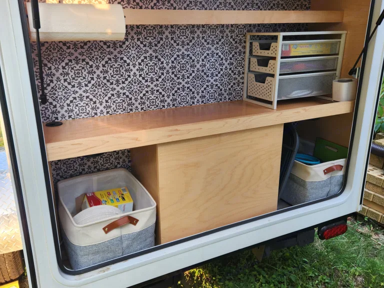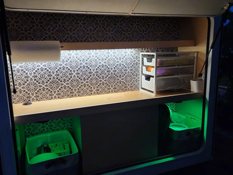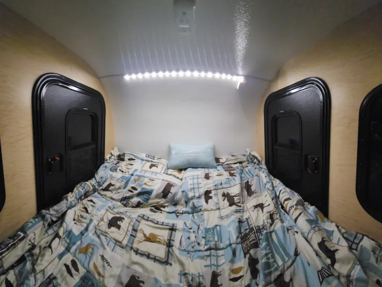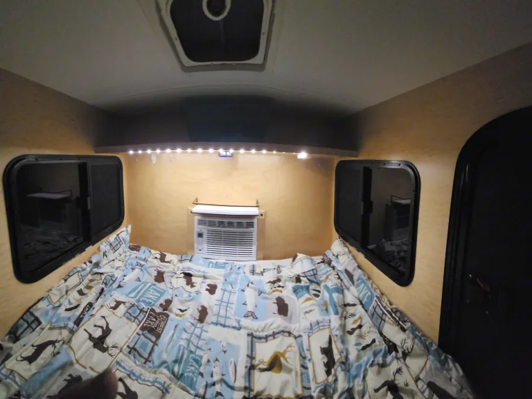 -Included on the back wall of the sleeping area are hooks to hang your keys!On the outside of the camper: