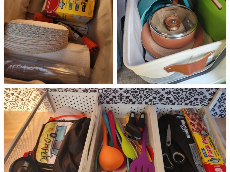-Kitchen: Can Opener, Wine Opener, Basic Cooking Utensils, Lighter, Pot Holders, Marshmallow Sticks, Pots/Pans, Collapsible Sink(Includes Soap and Cleaning Brush), Cutting Boards, Strainer, Mixing Bowls, and Foil/Plastic Wrap