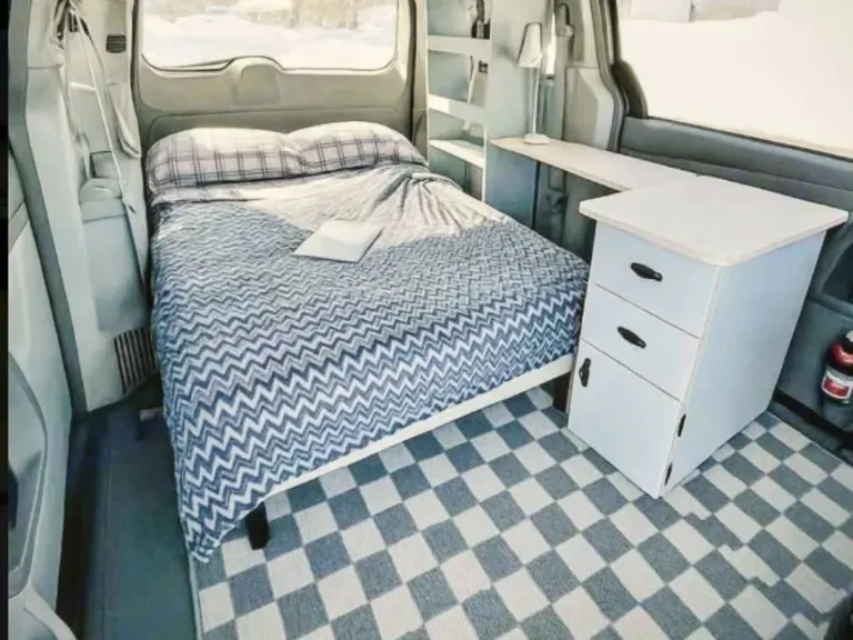 This RV rental's cozy camper van interior features a neatly made bed, a functional desk, and storage, all on a charming checkered rug.. Dodge B Van 2017