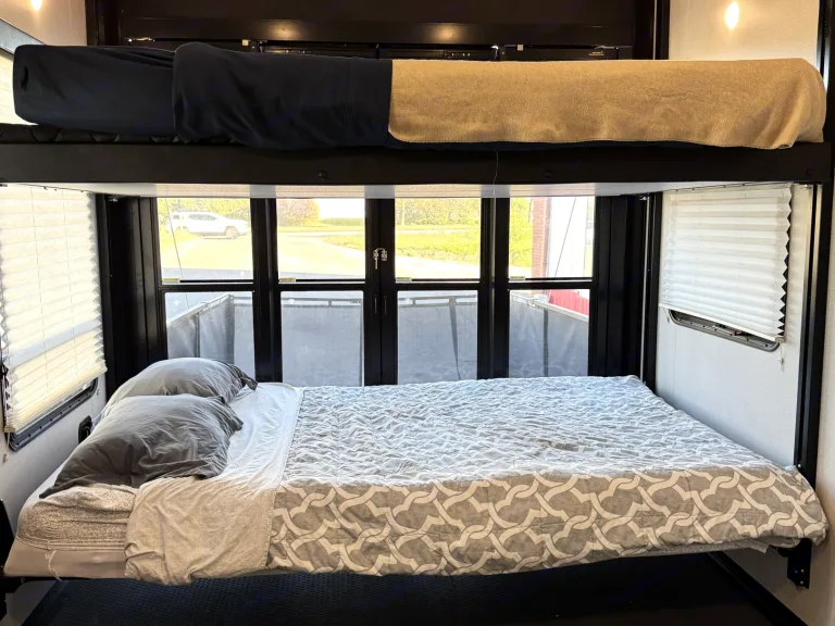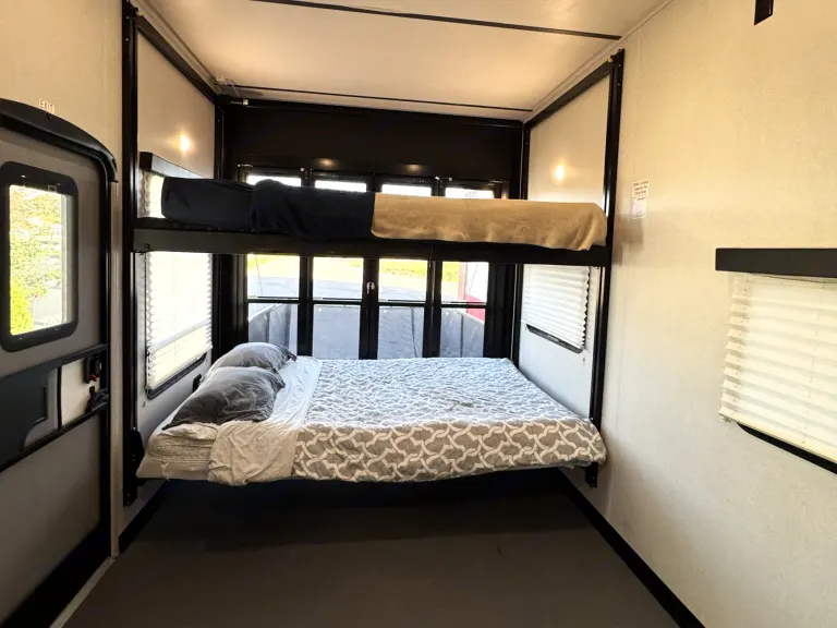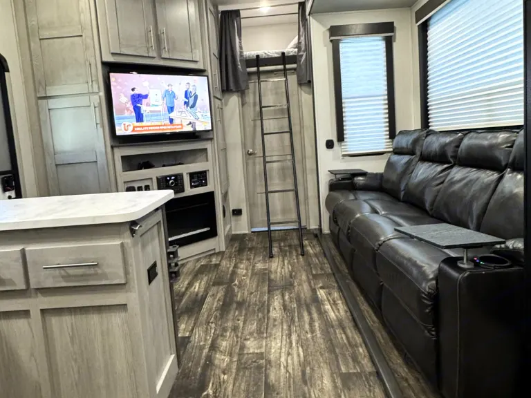 Adventure meets luxury in the 2021 Keystone Impact Fuzion 415 — available now for just $349 a night. This massive, 44-foot toy hauler is built for those who crave excitement without sacrificing comfort. Bring your ATVs, motorcycles, or extra gear — the spacious garage easily hauls it all and converts into an additional sleeping or entertainment area, complete with its own half bath and access to the patio deck for the ultimate outdoor hangout. Step inside and you’ll find a modern interior with reclining seating, a fully equipped kitchen featuring stainless steel appliances, and multiple sleeping areas including a king master suite, loft bed, and convertible garage space.