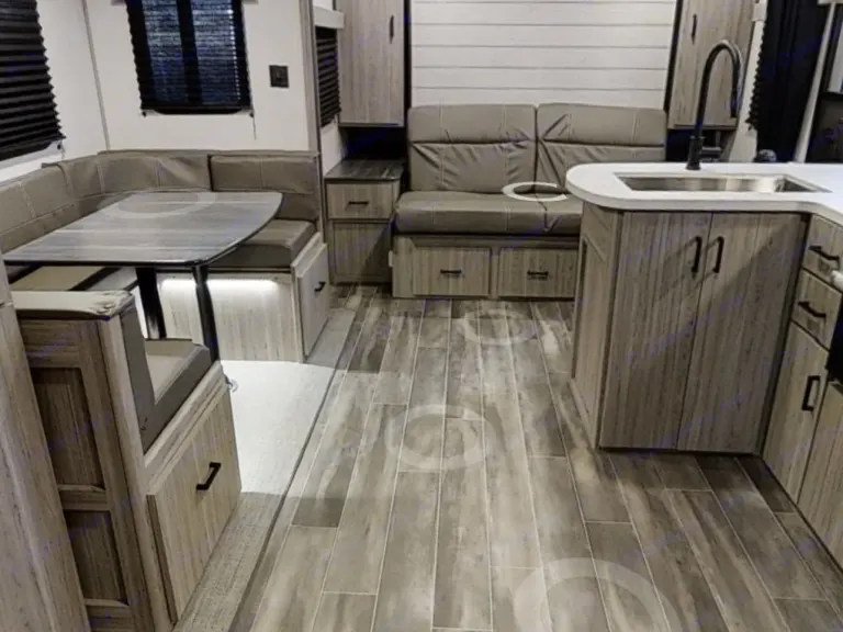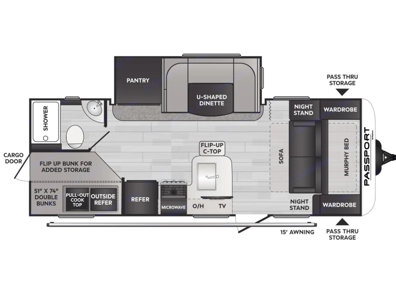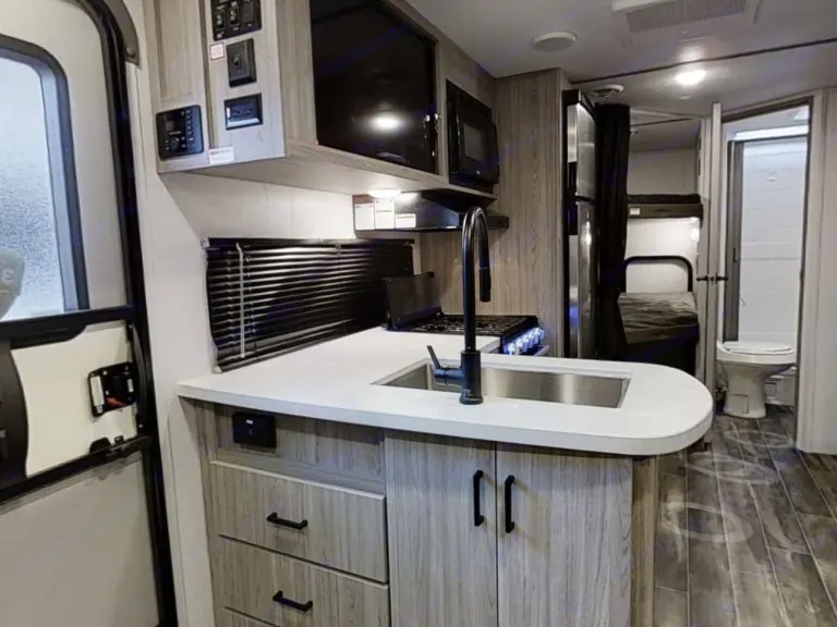 Super Clean Brand New 2022 Keystone Passport Super Lite 221 Bunk House is light weight and packs a punch when it comes to amenities. Comfortably sleeps 8 guests; 1 murphy queen bed, 2 double over double bunks, and the dinette converts into another sleeping quarters. The kitchen is equipped with a three-burner stove, microwave, oven, an 8-cu ft refrigerator/freezer and a enormous pantry with even more storage space. There's a three-piece bathroom featuring a stand-up shower, porcelain toilet and a sink with a medicine cabinet and extra storage below. It's perfect for any outdoor adventure or visiting family and friends. This coach features a lot of the creature comforts most want.