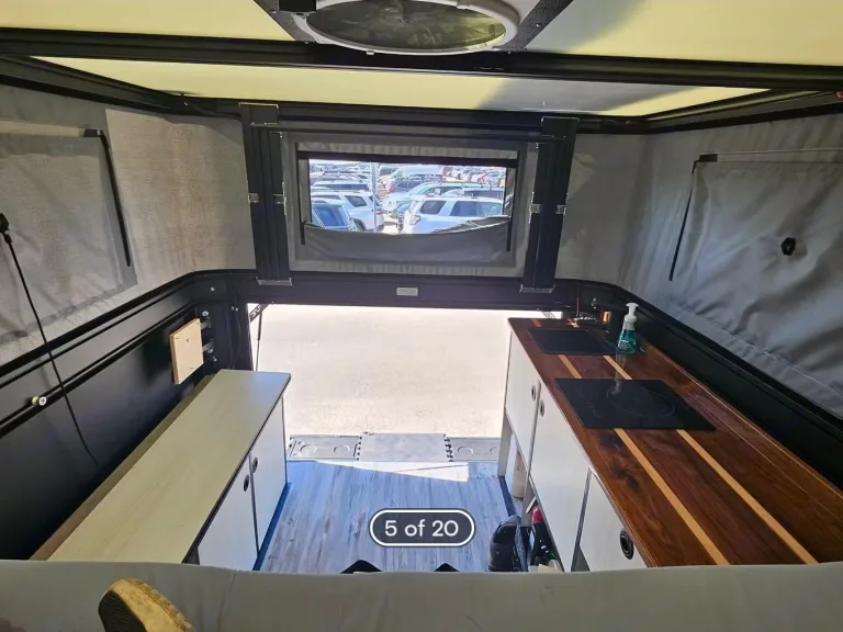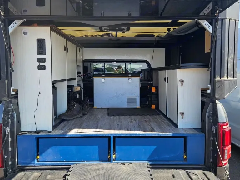 his vehicle will be equipped with a Tune Outdoor M1 Truck camper topper which features a King size bed above the cab , Max Air Fan , custom interior with induction stove ,Dometic Sink , fold out childs bed and drawer slides