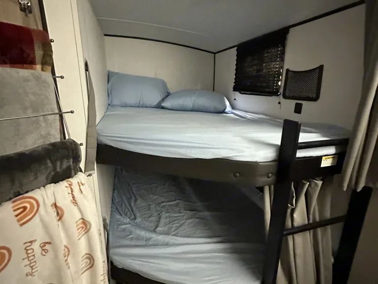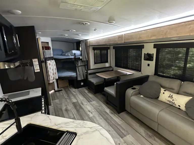 Come enjoy a trip in our travel trailer that sleeps 10 comfortably! Enjoy the modern updates in the camper and the comfortable sleeping areas as well lovely amenities such as Bluetooth speakers, fireplace, great air condition, lovely dining area and living room. Enjoy the awning during the day or night (has lights under the awning). There is a full on full bunk bed that we have added extra padding on to ensure the most comfortable sleeping experiences. The bathroom has an entrance from the outside of the camper as well as a door from inside the of the camper. What's included• sheets