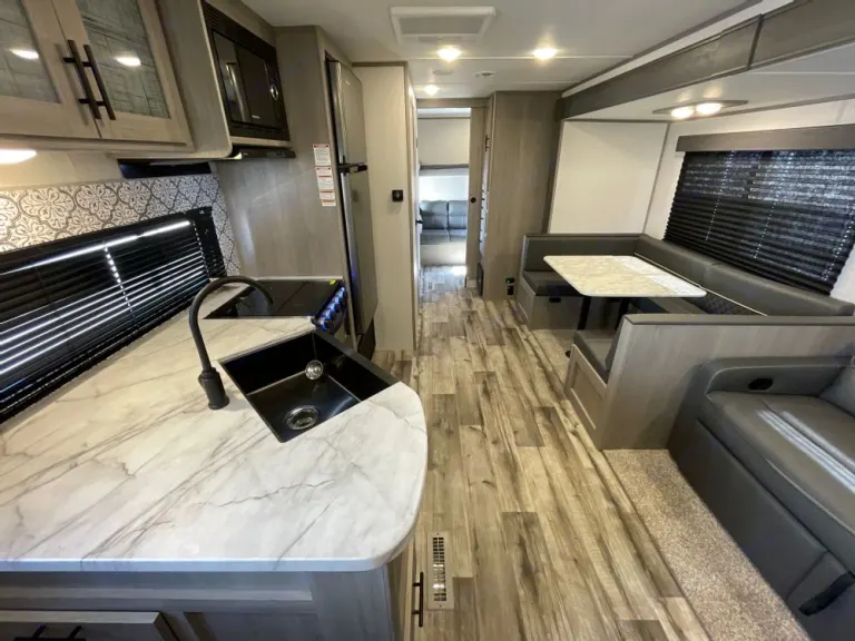 Great camper for small to large families. bunkhouse with 3 bunks and a couch that folds into a bed. Bunkhouse has a sliding door. Large kitchen with plenty of storage. Large fridge and freezer. There is plenty of room to set up a pack and play in the kitchen as we do every night. Master bedroom has a queen bed and lots or storage. Radio with indoor and outdoor speakers that can be controlled independently. Awning has led lights that are plenty bright enough to sit and play games under. Its has a small outdoor kitchen with a 2 burner stove and mini fridge. What's includedWe will provide some pots and pans along with plates, bowls, silverware and other basic kitchen utensils. Other things to noteThere will be a small vacuum and a broom. Please try to keep the camper clean from excessive sand, mud etc. To help keep the longevity of the camper.