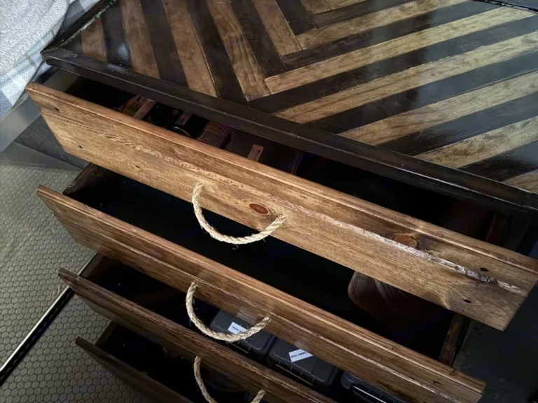 There is plenty of overhead storage to put all your clothes and or groceries. They are all removable and have shoulder straps which makes packing much easier.Seats 4 and sleeps 2 on a 6 inch memory foam RV queen mattress extremely cozy. It has 2 bunk windows at you feet and head of the bed, which is great for ventilation. Both front seats swivel increasing the interior living space.