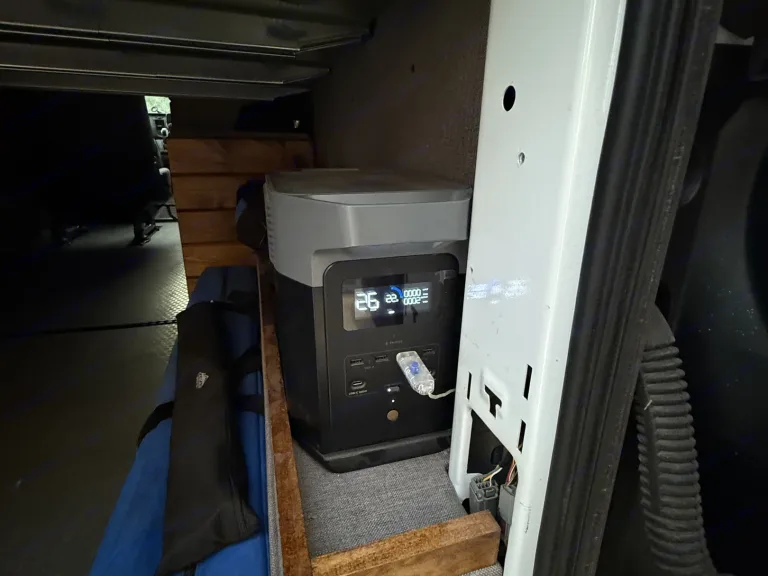 Al power is ran off a 1000 watt EcoFlow battery unit easily accessible from the rear of the van. The overhead fan, interior LED lights and electric fridge are ran off of this large battery.