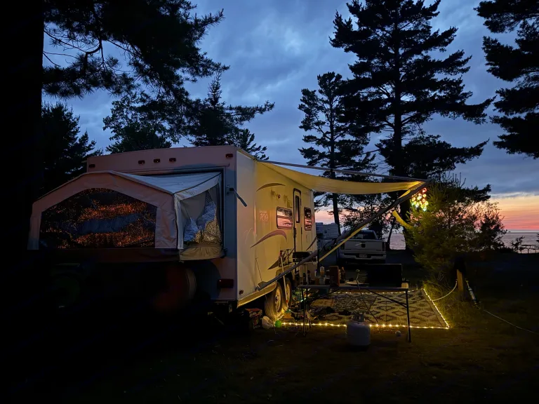 Nestled in Michigan’s breathtaking Upper Peninsula, our Rockwood Roo camper is the perfect home base for exploring waterfalls, hiking trails, and discovering hidden lakeshores. With cozy fold-out beds that let you drift off under the stars, a kitchen equipped with all the essentials (yes, including a coffee maker!), and a roomy, comfy living space to unwind after the day’s adventures, you’ll have everything you need for a stress-free getaway.Whether you’re sipping coffee by the campfire, taking day trips to Lake Superior, or just soaking in the peace and quiet of the woods, this camper makes it simple to blend comfort with the magic of the outdoors.Your next U.P. escape is waiting. Just bring your sense of adventure! What's included• Utensils