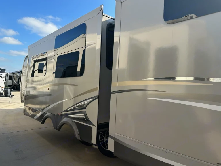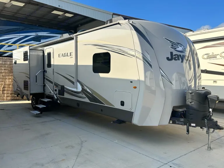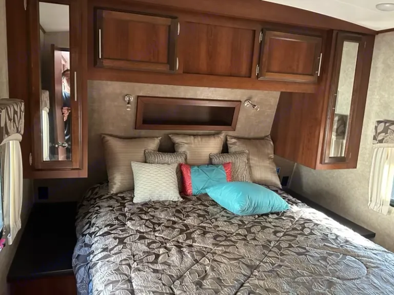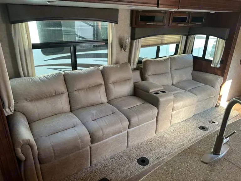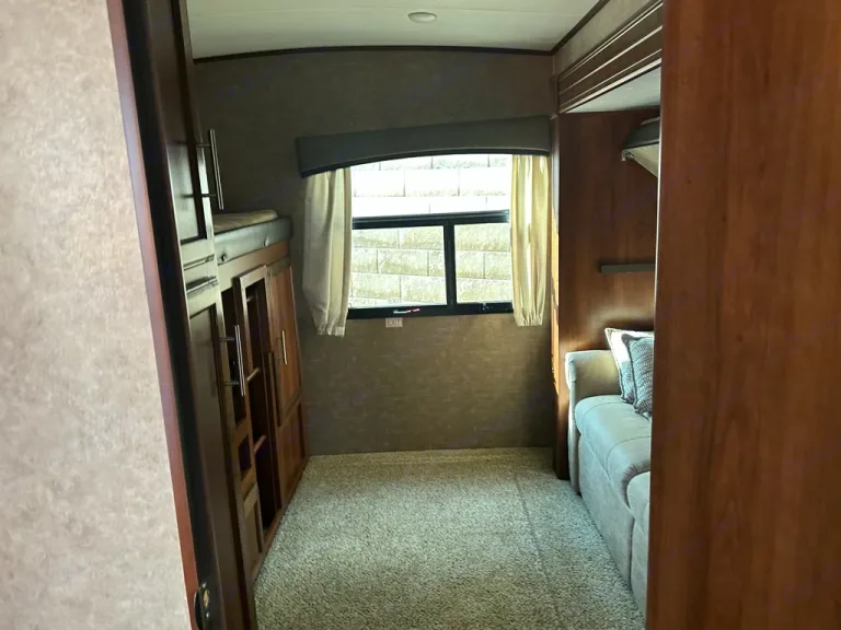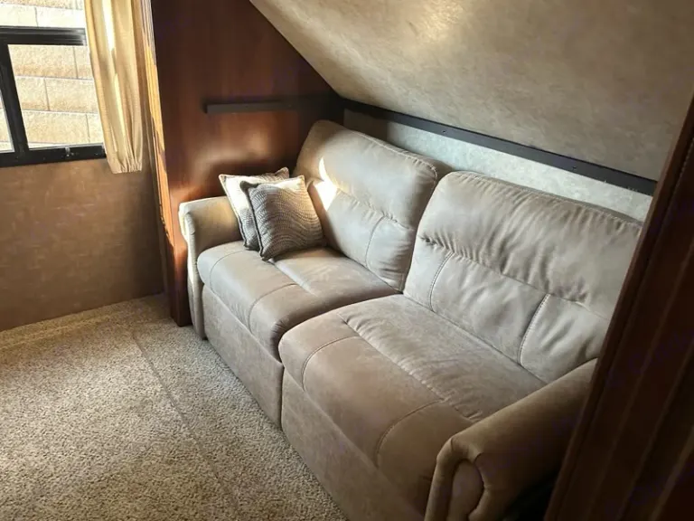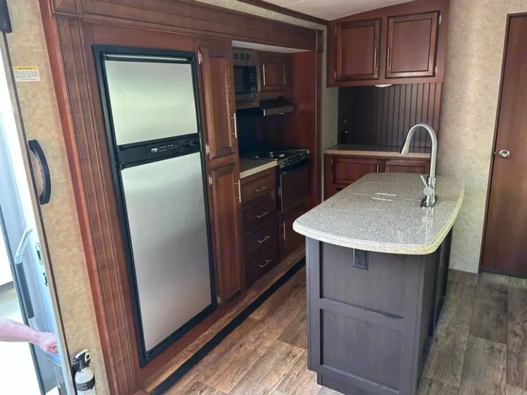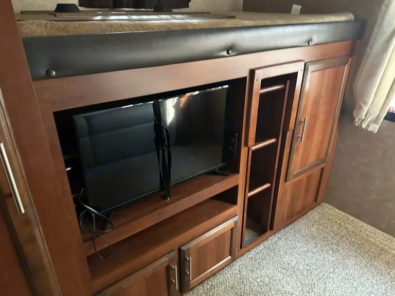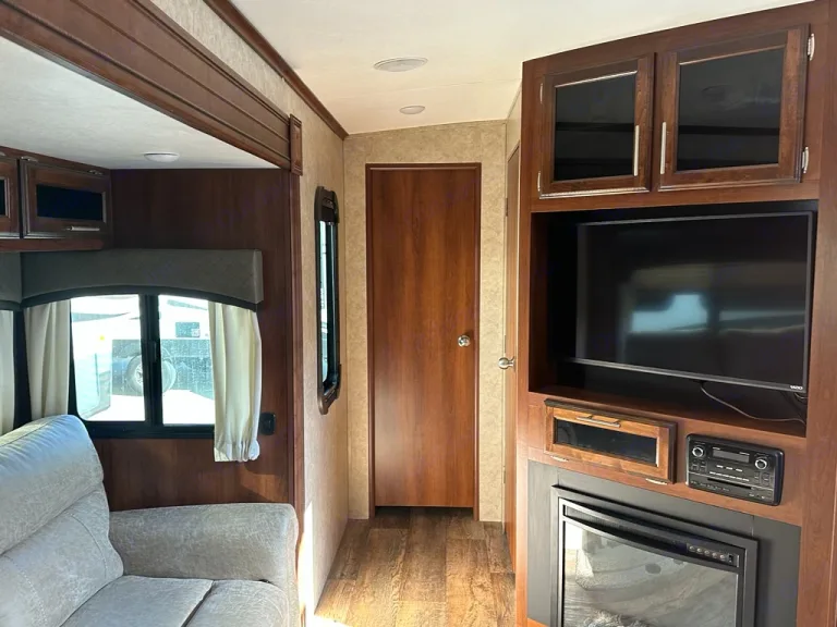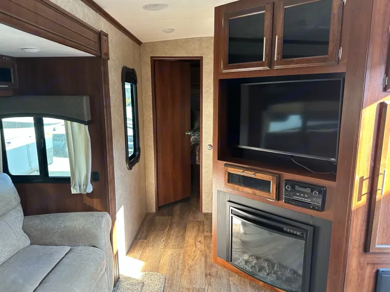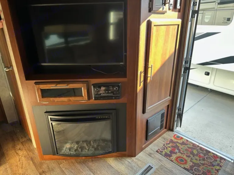 Enjoy the outdoors with this large spacious 3 slide RV with a large shower and an Island in the kitchen. Although it has a large spacious indoor living area it also has a large outdoor kitchen with a Tv and out door speakers if you prefer music for those late nights sitting under the stars or you can enjoy a glass of wine while relaxing on the couch with the electric fireplace.There is a room in the back for the kids to enjoy with two bunks and a pull out sofa where they can unwind and watch TV from a long day being outdoors.Ultimately this Travel Trailer has everything you need to comfortably enjoy the outdoors.What's includedPots & pans and utensils.RecommendationsPlease make sure when booking a camp site you put that there are two slides on the drivers side and one on the passenger side of the RV.Other things to noteNo smoking in unit