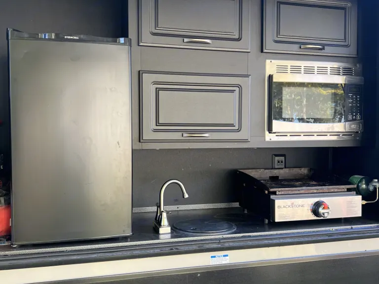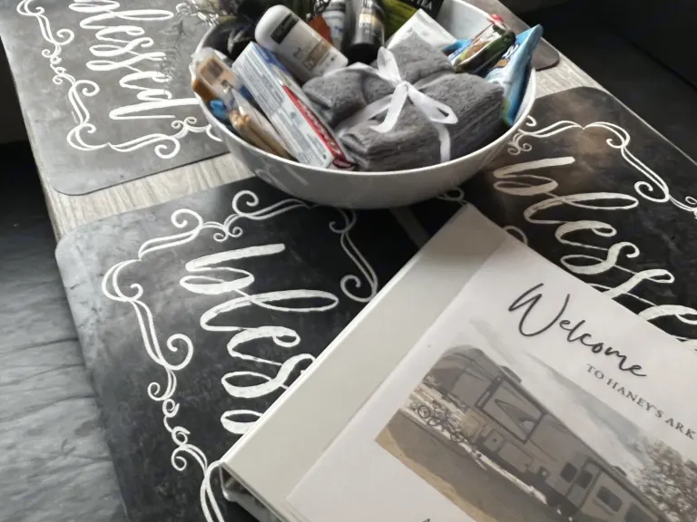 Haney's Ark is perfect for the small to mid size family or group of friends! Able to sleep 9 comfortably, this gorgeous, compact vacation on wheels offers a place to gather round and watch tv together with a soothing fireplace, cook a full meal with the stove, oven, and microwave, and enjoy your preference of listening to whatever jam on our full surround sound (and outside) speakers! The master bedroom, second room and the living room each have a tv for their own viewing if y'all just can't decide on what to watch together. Lots of items? That's ok! There's a ton of quarter space to hold your items and keep them safe! If you have clothes you need to wash, use our convenient washer/dryer in one and don't miss a beat! Just because you're camping does not mean you have to lose the convenience of luxury. . . the Haney's Ark provides you the best of both worlds!What's includedThe rig includes:Plates