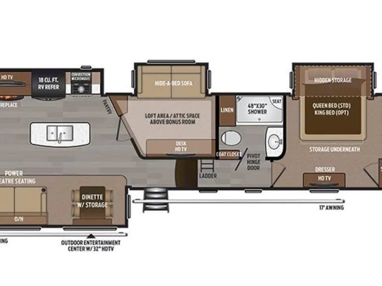 The Montana 3950BR features a luxurious private bedroom with a king-sized bed, premium mattress, and large wardrobe closets. Additional storage includes overhead cabinets and a dresser, making it easy to store clothing and personal items.Entertainment & Living Area: