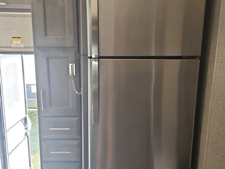 Step inside and be blown away by the spacious and comfortable living area. The RV is stocked with plush seating, a flat-screen TV, and a dining table perfect for dining or playing games with family and friends. The kitchen is fully equipped with all the conveniences of home, including a refrigerator, microwave, stove, and oven.