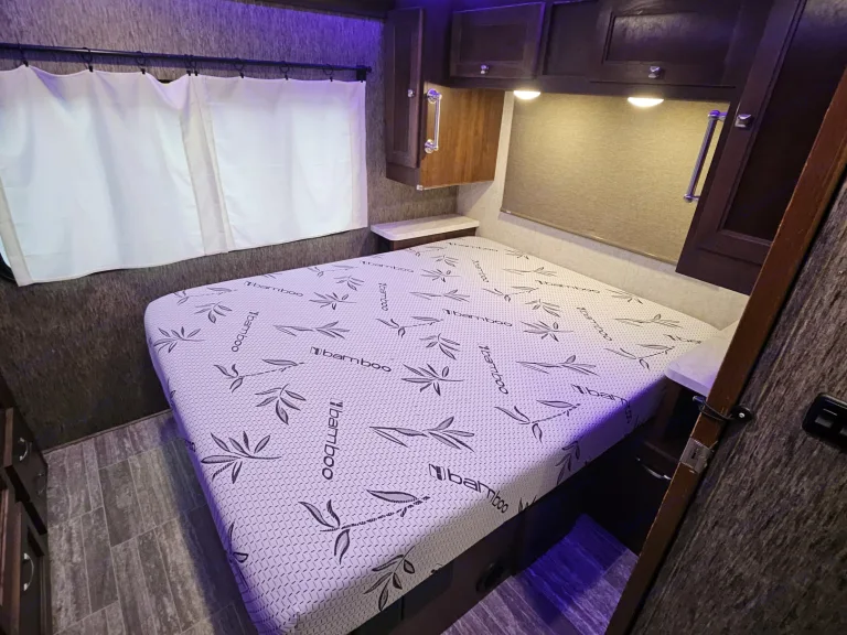 RV rental bedroom featuring a bamboo mattress, dark wood cabinets, purple accent lighting, a window with curtains, and wood-look flooring.. Forest River Forester 2018