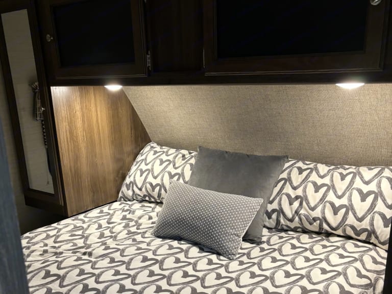 Looking to getaway from city life this summer? Look no further! Our well-kept, large travel trailer is perfect for short or long-term rentals. It easily sleeps six people, but can accommodate eight. It has all the amenities to make you feel at home and comfortable during your camping adventure!Take a virtual tour of a 2017 Bullet QBS trailer to understand the layout and amenities better: https://www.youtube.com/watch?v=YiPmtCxsiVwYou will find a spacious queen-sized bed (with sliding doors for privacy), a fold-out couch, and three bunks in the back, with an additional bunk if needed (converted from seats and tables in the back room).The bathroom is equipped with a toilet and a shower. An outdoor shower is also available.The trailer features one TV with DVD and sound system. Board games are also provided for your enjoyment!Worry not! There is lots of storage available in the trailer and within the outside storage compartments.A beautiful slide out will make the kitchen area more spacious and allow you and your family to relax and enjoy a meal at the table while taking in the view from the surrounding windows.Included in your rental are:Plates, bowls, cups;