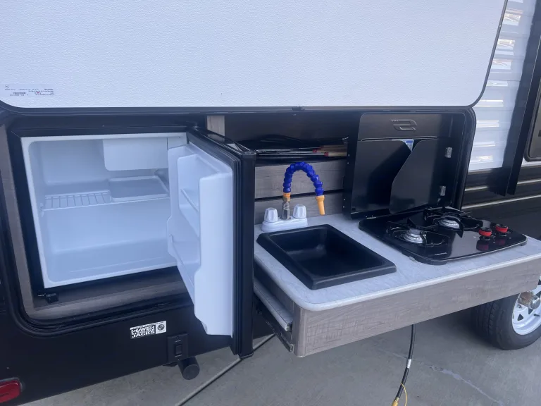 Outside kitchen with sink and two burner cooktop and outside fridge.