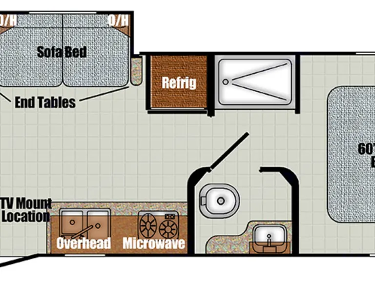 Camper includes the following inside: Air conditioner, 20,000 BTU heater with thermostat, LED lights (as well as vintage ambiance lighting throughout), 3 burner range (with cover), oven, sink with cover, 6 cu. ft. vintage refrigerator/freezer, TV with 2 mounting bracket locations inside and one outside, booth dinette and couch that both fold down to full size beds, 60"x74" walk around bed, privacy curtain for sleeping space, separate rooms for toilet/sink and shower, ample storage cabinets and drawers, and basic camp supplies such as a k-cup coffee maker, toaster, set of 4 plates and utensils, spatula, pot/pan.Outside: 30 amp electric cord, fresh water hose, sewer hose and all supplies needed for sewer hook-ups, power awning, power tongue jack, stabilizing jacks, LED lights, outdoor hot/cold shower, storage compartments.