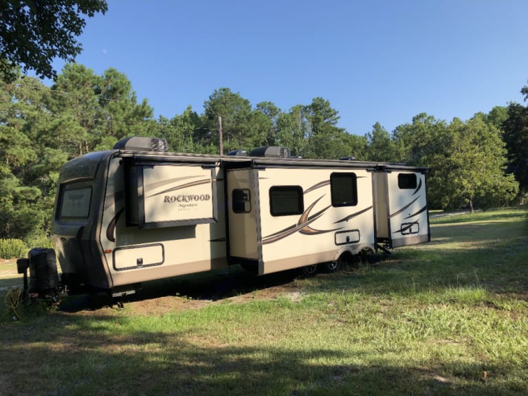 A beautiful opportunity awaits you with my camper rental. This spacious camper has four slides to expand your experience. With a set of bunkbeds, and with the much requested bunkhouse w/ twin, we’ve got your kids and guest covered. It has as a spacious queen bed in the master, with a set of sliding doors to provided privacy for renters. You may haul yourself to festivals (no burning man), races, and tailgating . From one ocean to the other, and anywhere in between, allow yourself the conveniences of home on the road. . You’ll have ice cold air for the heat and propane heat will keep you toasty in the colder climates. Double sink, granite countertops and refrigerator with freezer are just some of the features awaiting you in our kitchen. You’ll have a u shaped table that folds down to provide even More sleeping space. It’s a pet friendly rental. However, there is a pet rental fee of $75. You’ll be responsible for repairs that are required due to your pets. You’ll need to pack your own linens. We do expect the courtesy of you treating our home like you would your own. We invite you to use our home away from home. What's includedI will provide dishes, silverware, cooking ware, cleaning supplies, and fresh linens. RecommendationsI have taken my rig to Zooland in Asheboro.