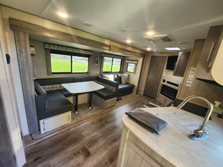 This beautiful camper with black and grey interior has everything to offer! Sleeps up to 10, but comfortably 9. Has indoor electric fireplace and TV, with indoor/outdoor surround system. Fridge, stove, microwave, indoor shower, full table (puts down into bed), fold down couch, bunk beds, master bedroom with queen bed. Outdoor flat top and fridge. Outdoor shower. Light up awning. Tons of storage! $150 cleaning fee if not cleaned and swept out (must be in same condition as whenq it left our driveway). Pets are allowed- but 50.00 will be automatically deducted from deposit for extra cleaning needed. Camper is Brand NEW used only 2 times last fall.Includes corn-hole, plates, cups, cutlery, toilet paper, silverware/utensils, paper towels, and 9 camping chairs. You must bring your own pillows, blankets, sleeping bags, ect. Generator is available at additional cost. There is a storage rack at back of camper for bikes or coolers. Pet friendly, NO Smoking of ANY kind inside, will rent to only 35 and older.Camper can be delivered for additional fee on my days off, otherwise you must know how to pull and back up a camper of this size. You can pull it with a 1500 series truck. Impact driver and level are included for leveling jacks. We are located just 2 miles away from Holtwood campground in Oconto, WI. $225 cleaning fee will be charged if camper isn't cleaned, And waste tanks are not emptied and flushed. This will be adjusted depending on what needs to be done. We understand normal wear and everything.