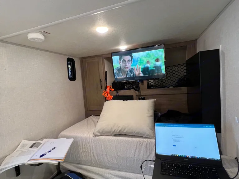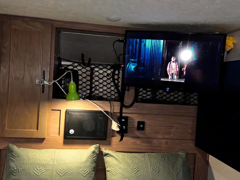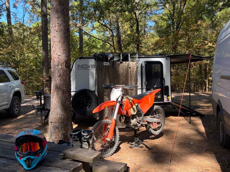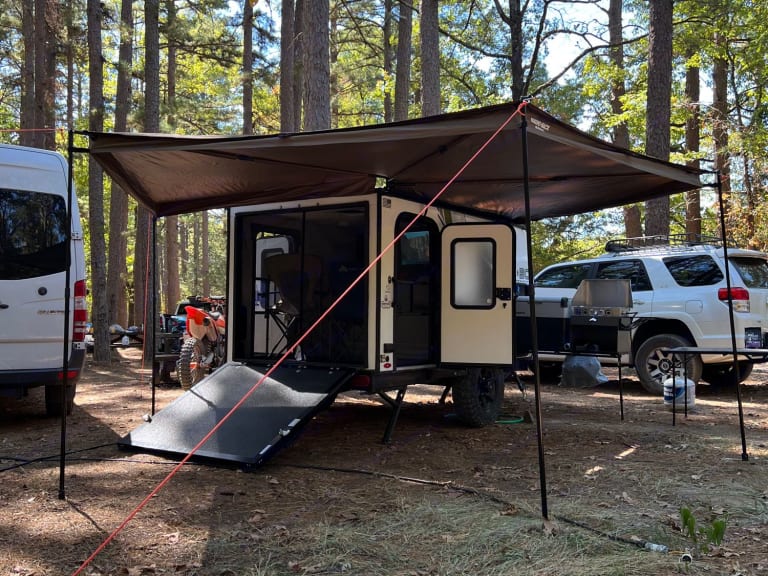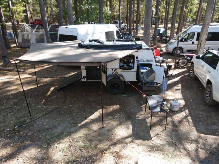 Thank you for considering the Land Run for your next trip. The Land Run is a lightweight toy hauler that fits two dirt bikes or mountain bikes or a four-wheeler. This compact trailer is only 14ft long and packs most necessities into a small frame that’s easy for most vehicles to pull. This includes a queen size memory foam mattress, maxxair fan, plenty of storage space behind the tv, a full pantry, tankless water heater for hot showers and a lot more. It has an unloaded weight around 1800 pounds and offers a 30 gallon water tank for the outdoor kitchen area and shower.What's includedOur camper comes stocked with all the essentials to ensure you have a comfortable stay: