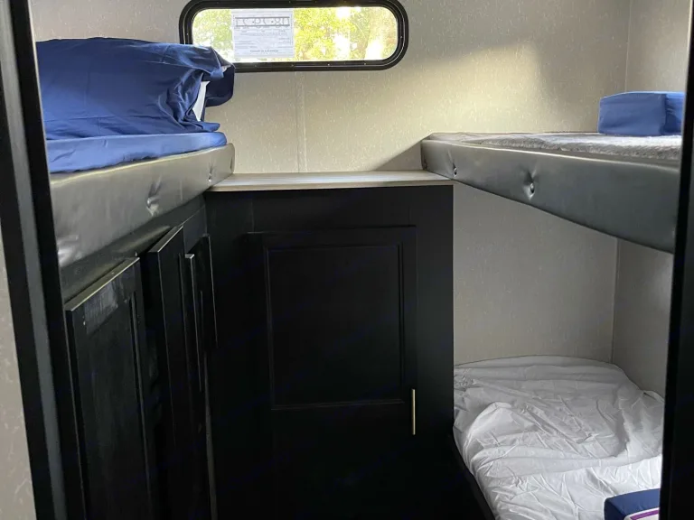 ***Please Make Sure YOU GET Full Hook UPS (water, sewage and electrical)Perfect Trailer for a modern relaxing getaway. Will Sleep up to 10 people but sleeps 7 comfortably. 3 inch Gel infused Queen bed sleeps 2. Three bunks sleep 3. Leather sofa pulls out to sleep two. Table will fold down and cushions form another mattress to sleep another two or three small children.Complete kitchen with refrigerator, microwave, and gas cooktop. Large farmhouse style sink is convenient for washing dishes. Sink cover increases counter space (but isn't a cutting board). Bluetooth to play music over the indoor/outdoor speakers. USBs and plugs throughout. Tons of lighting. Awesome awning featuring blue LED lights. There’s also blue LED lights on the inside. Want to stay in for the night because it rained? Watch TV in the main living area or the master suite.Well kept and immaculately cleaned RV.Well-behaved dogs are allowed with some restrictions and $15 per pet fee. Contact owner for details. Absolutely no cats allowed.FOR Pick UP/Drop OFF: Please