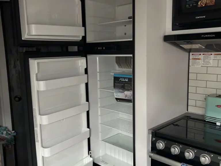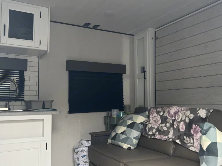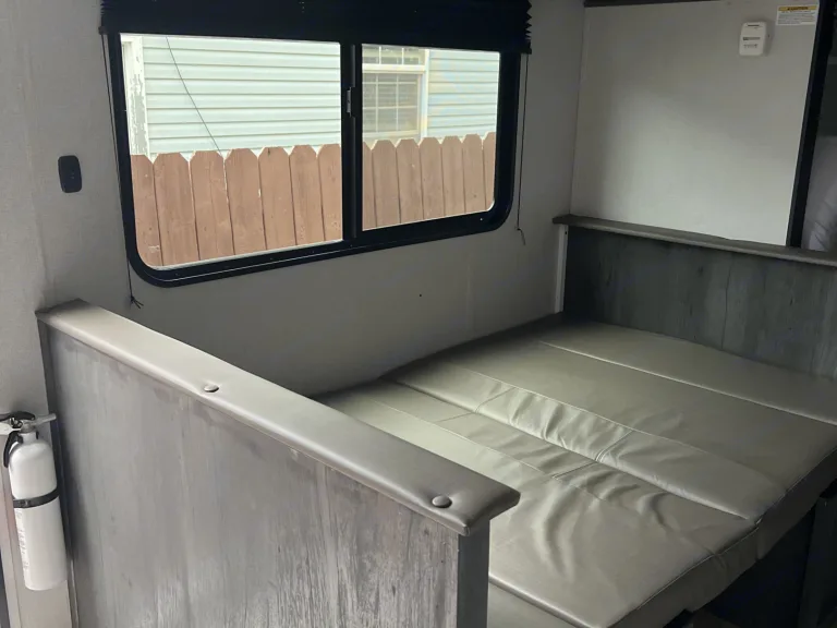 Newer rv. Feautures a murphy style queen bed. During the day it can be lifted up, there is a couch under neith. It also has full sized bunk beds and a table bed. This camper has an indoor cooktop as well as a fridge and freezer. The best part, this camper has a shower and a tub. Super convenient with little ones. What's includedFresh linens, scewers, paper plates, plastic silverware and plastic cups included. Under the bunk beds is storage that has a table and two chairs. RecommendationsPerfect for camping, beach trips or a festival. Other things to notePlease no smoking. Animals are great, but please no damage.