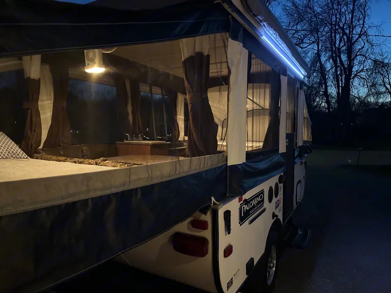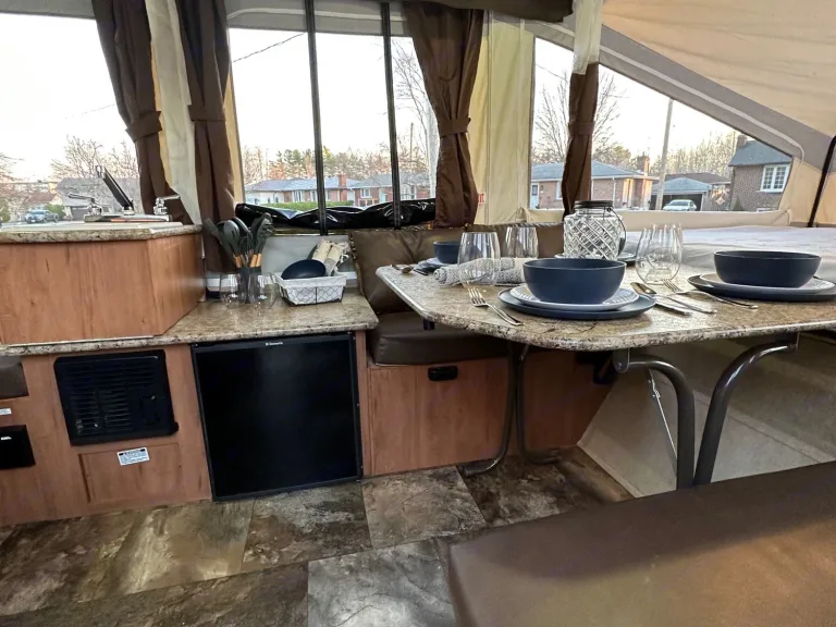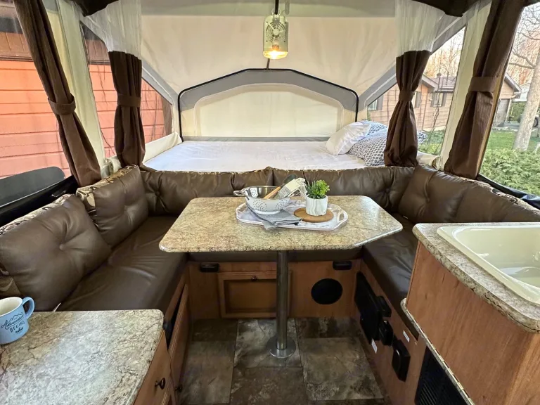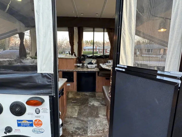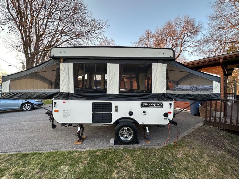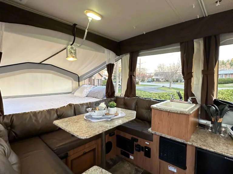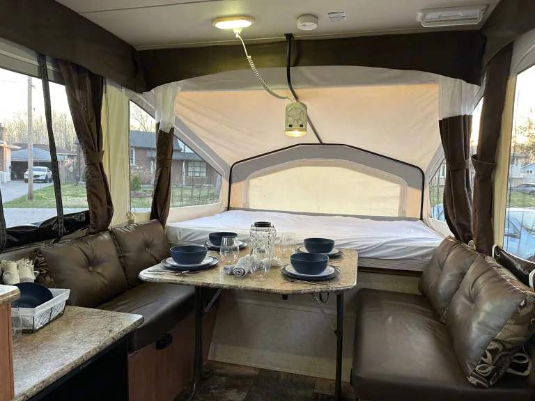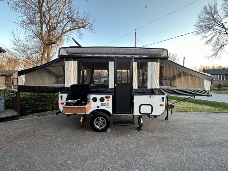Get away in this spacious 2015 tent trailer equipped with the following:Sleeps 8 max: (60”) 1 queen bed, (54”) one double bed, plus both dinettes turn into beds (40” & 45” smaller than a double but larger than a twin)