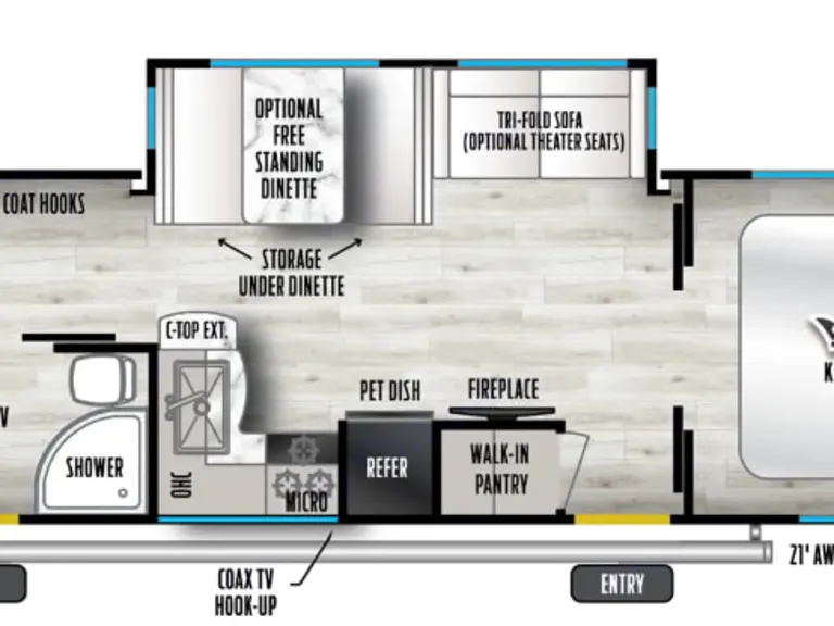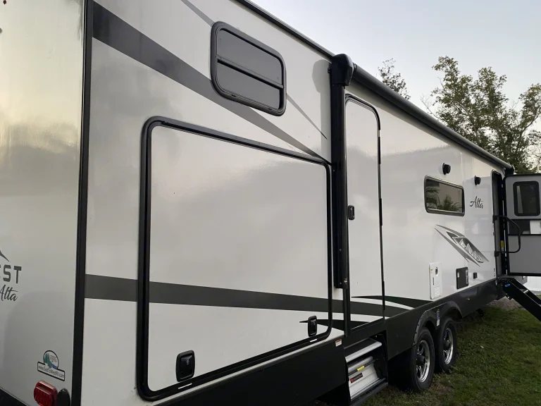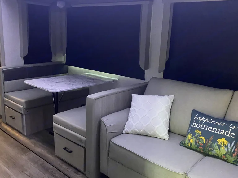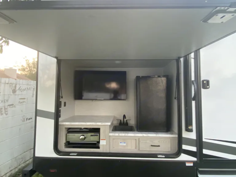 Outdoor amenities: include folding chairs and tables, outdoor rug, grill, outside fridge, and LED lighting under the large awning. Outdoor speakers are connected to the internal audio system.