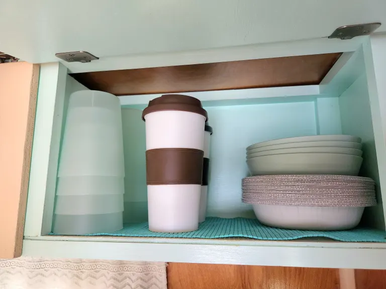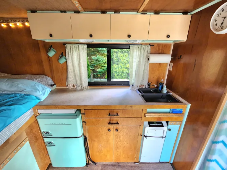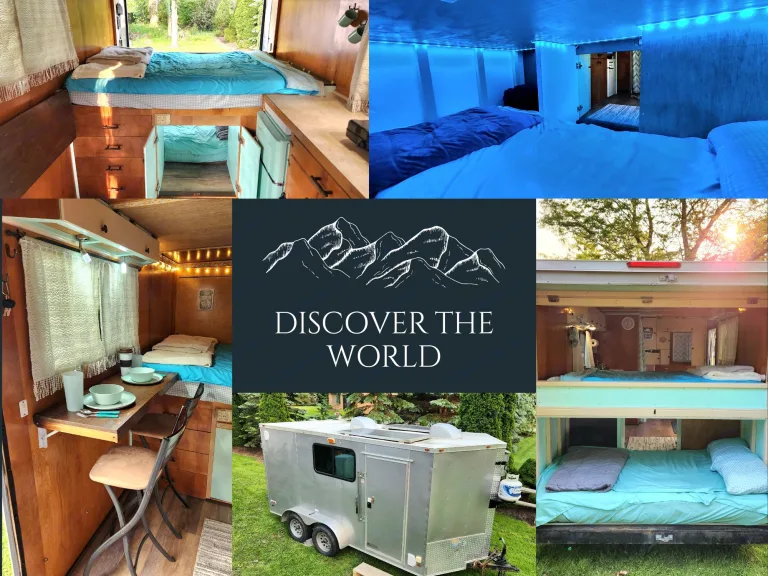 In addition to the primary memory foam bed, there is also a lower level bunk that can be used for storage or as a second sleeping area! This lower bunk has color changing LED lights with remote control and a secret crawl space through the cabinet doors under the top bunk! The upper wall behind the top bunk opens up as well, so you can be one with nature while curling up in cozy blankets. (There is also easy access from the back doors)