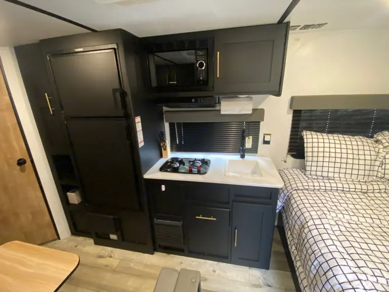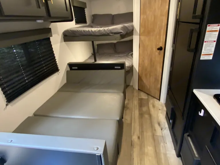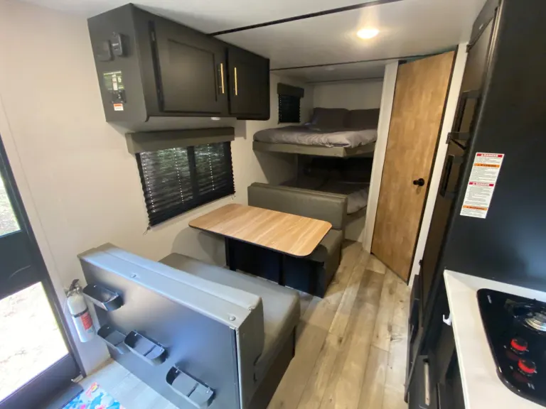Get ready for some fun! This camper is the perfect mix style and function, with 3 big beds and a convertible dinette.We deliver our campers to your reserved campsite. Our campers are fully stocked, delivered and set up for you- you just come relax and we'll take care of the heavy lifting :)This camper comes with linens, dishes, towels, coffee pot and a tv.