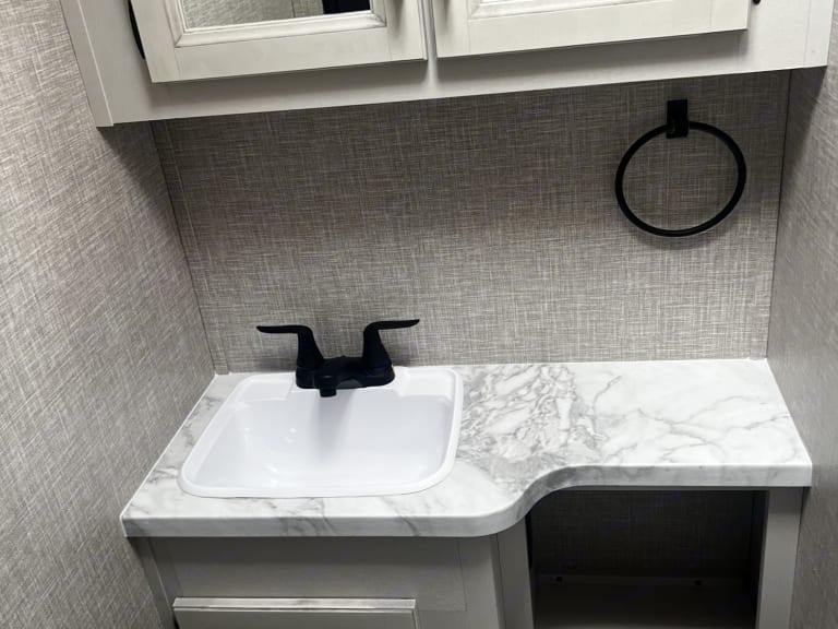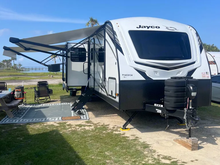 Book this brand new home away from home today for your next adventure! This is our Jayco White Hawk 32BH with an amazing floor plan from the queen size master bedroom with extra closet space to the open dining, kitchen and living area. The bunk room has an entertainment center with smart tv with twin size bed on top. The couch folds out to a double bed and there is a bunk above the couch! This unit sleeps 9. The private bunk room with its own door also contains a half bathroom. There is a full bathroom in the hallway outside of the master bedroom.