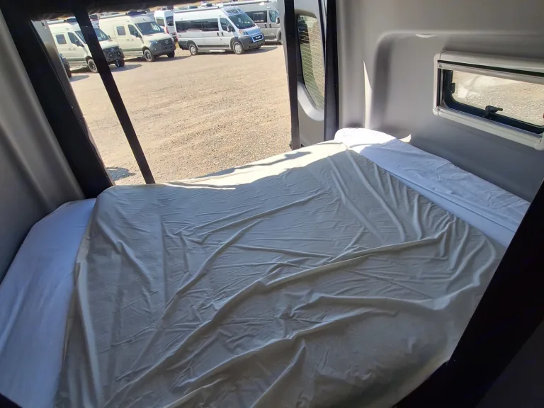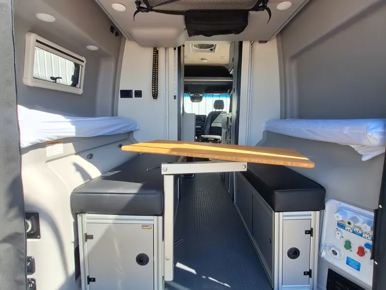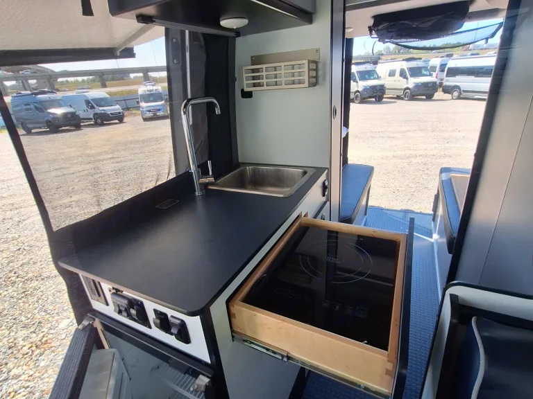 Adventure van built for two with galley, small refrigerator, bathroom and versatile garage space for adventure equipment.