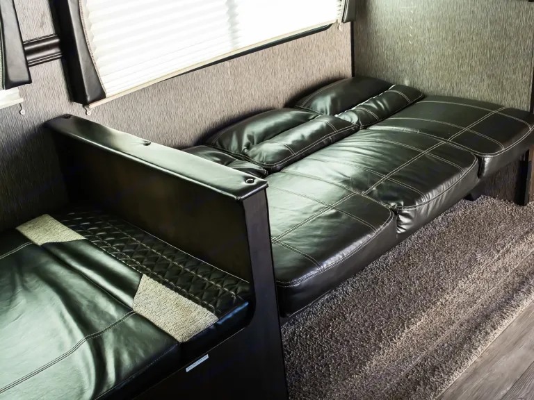 Sleeps up to 10 – A true family- and group-friendly layout with a private queen bedroom up front, double bunks in the back, a convertible dinette, and a sofa sleeper.