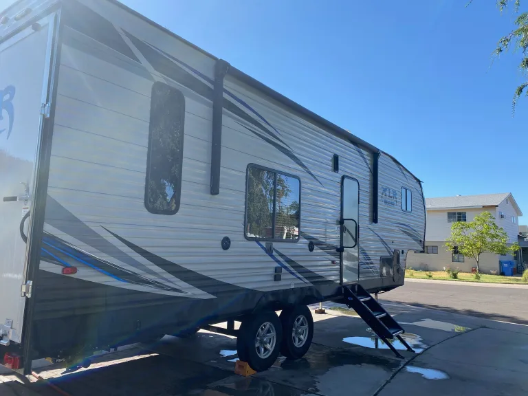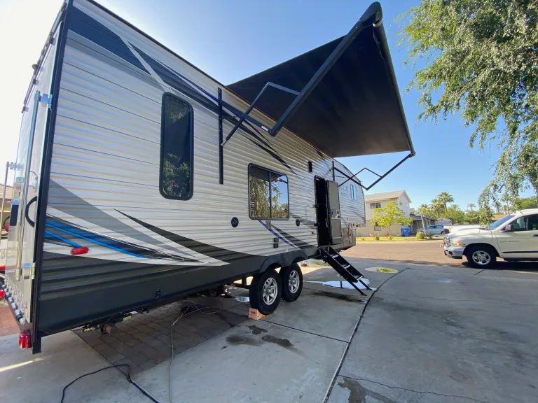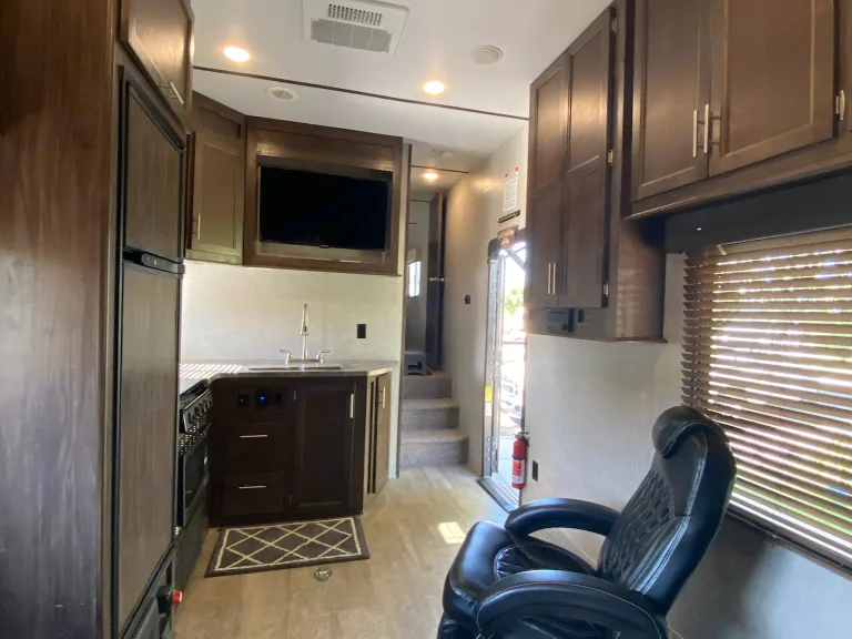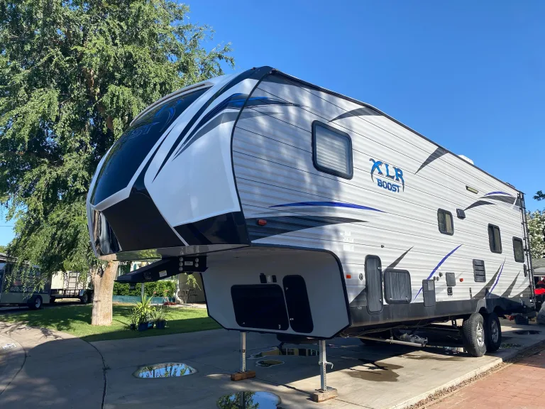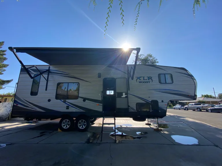 This XLR Boost 33RZR16 toy hauler is an amazing 33ft fifth wheel with spacious cargo room! Comfortably park your ATV or dirt bikes inside to take with you on your camping adventure.Across from the entry door you will walk into the kitchen, with a large L-shaped corner counter with ample room to prepare food and brew some fresh coffee. There is plenty of overhead cabinet storage for your plates and pantry items, along with 3 drawers for utensils. The kitchen is as complete as your own at home, with a 3 burner range stove, refrigerator and microwave which can also function as a convection oven!There is a large flat screen tv overhead to watch your blue-rays and DVDs, with the. controls on the wall next to the entrance.The living area has two swivel recliners, a dinette which converts into a small bed (ideal for a kid or teen). In the rear or cargo area there are two comfortable couches and a folding dinette table. These two couches (which seat 2 or 3 each), turn into a large queen bed. Above is a hydraulic lifted queen bed with a detachable ladder.There are blackout covers which can be removed by snaps, for all the windows which are near the sleeping area in this living room/cargo area.The bathroom is up the stairs through the door on the left. Inside there is a pedal toilet, two storage cabinets, spacious glass curved corner shower, and sink. There is a private door leading from the bathroom into the master bedroom.The front master bedroom has a very comfortable soft queen bed, nightstand, wardrobe, overhead cabinets with two large windows.Solar panels help minimize the need to use the generator and is great for keeping your devices charged and ready to go. USB plugs are located in the kitchen area.Outside you can store all of your extra camping gear in the pass-through storage area.The awning provides plenty of shade or protection from rain. There are also extra front & rear flood lights on the sides of the trailer, newly installed.Other things to noteDogs are welcome, but sorry no cats! No smoking inside trailer.