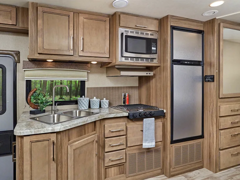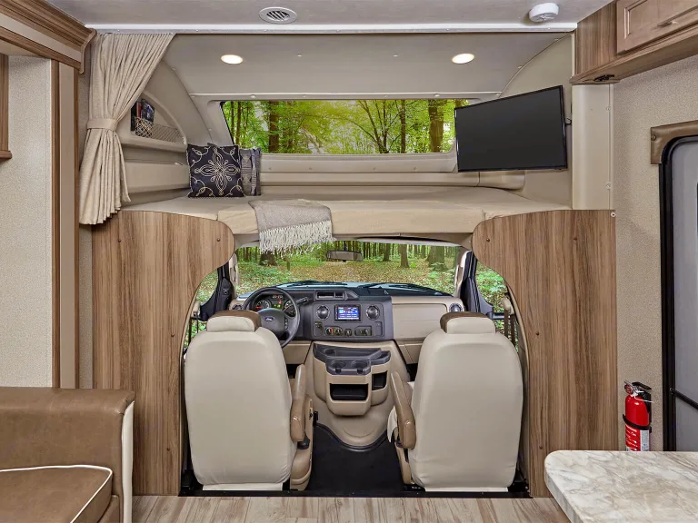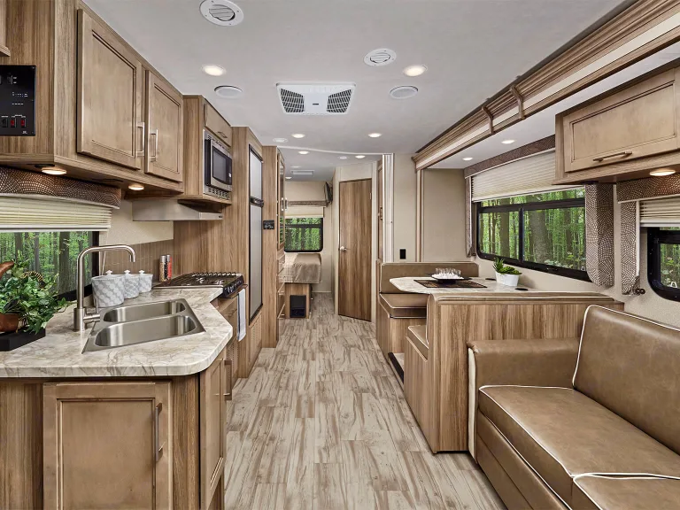 The Odyssey is a truly unique Class C motorhome for travelers that love the freedom of the road. It features many of the amenities and floorplan designs found on high-end Class C coaches. Frameless windows, a one-piece fiberglass roof and premium ride and handling gear all make for a smooth trip. The above cab space can easily sleep two adults and has retractable moonroof to let you see the stars. All of your basic amenities are right at your fingertips, and with just a few minutes to stock the large wardrobes and kitchen cabinets, you will be ready to go at a moment's notice. This model offers two slides that open up the interior living space so that you can easily move about when spending time indoors, and the complete kitchen with its 8 cubic foot flush-mount, double-door refrigerator, convection microwave, and double sink will have you prepared to cook up a feast during any excursion you take. The rear corner bath and slide-out queen-size bed provide a semi-private retreat behind a curtain that can be pulled closed, and the full bunk over the cab delivers additional sleeping space for any children or guests you have traveling along with you.