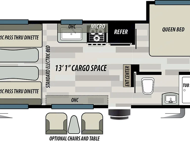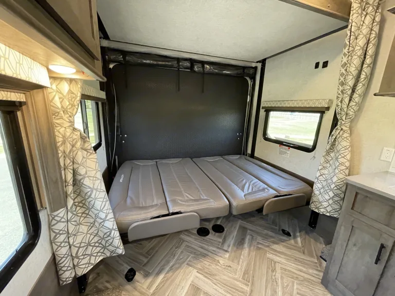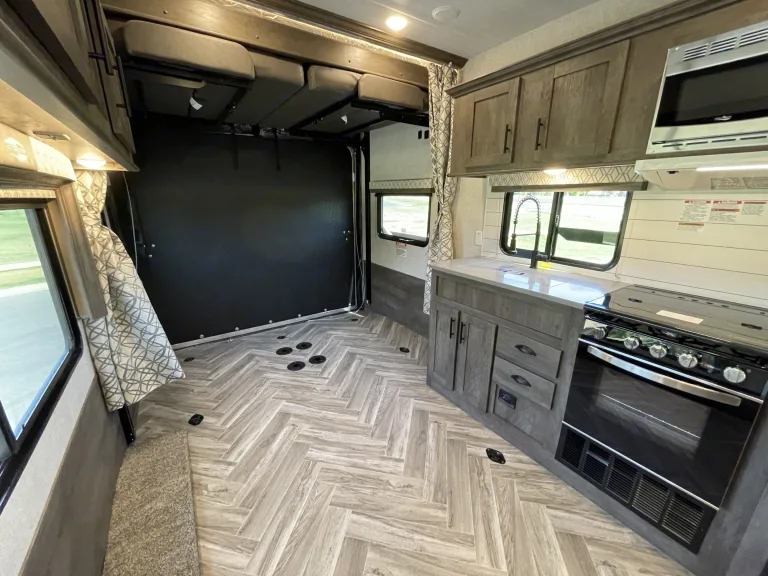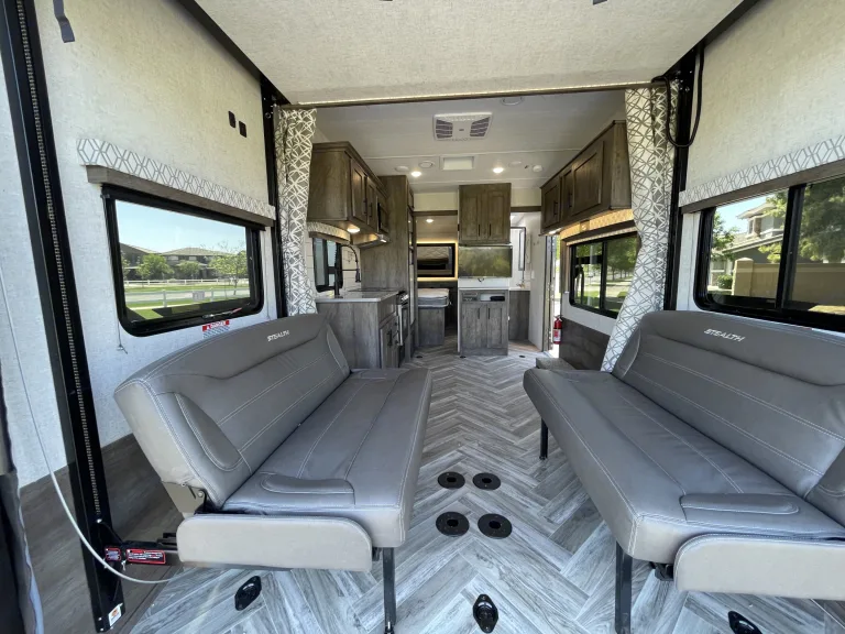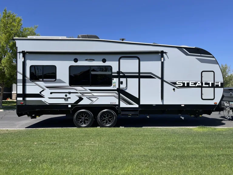 The 2414G by Stealth is perfect for any type of trip! It has a full kitchen, full bathroom with shower, refrigerator, heater, a great stereo system. This trailer sleeps 5-6 people very comfortably and has three full-size beds! It has a separate front bedroom and also has a sofa that also turns into an additional sleeper. This toy hauler will fit 64 inch wide side by sides (NOT 72 inches). This trailer is considered a lite weight toy hauler and can be towed with 1500 trucks with a towing capacity of 9900 pounds or greater.