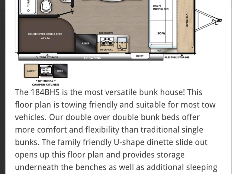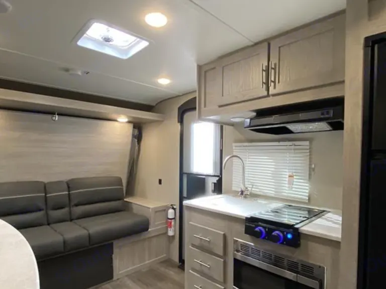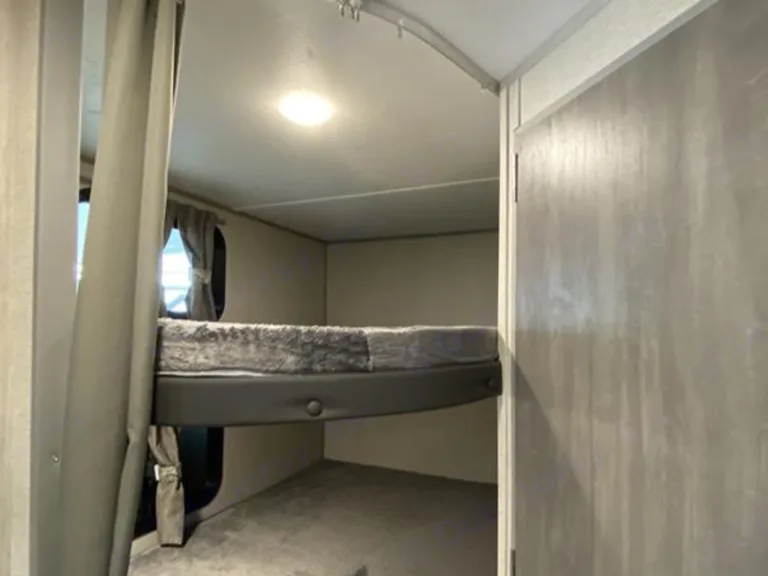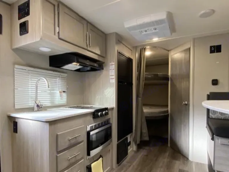 Light weight travel trailer with all the comforts of home. (1) RV fold down bed and full U shaped dinette pop out that converts into bed. Extra wide bunks and full bath. Outdoor kitchenette with pet leash attachment. What's includedFresh bed linens, (4) sets of dinnerware [plates, bowls, cups, eating utensils], cookware, cutting board and knives, (2) camping chairs, outdoor mat, ice trays, cleaning items [dust pan, mini vacuum, Keurig coffee machine w/k-cups, swifter wet pads, sponge, and magic eraser], travel size personal use items [shampoo, conditioner, bar soap, toothpaste, hairspray, and lotion], 24” tv, built in radio/ speakers for both indoor and outdoor [bluetooth comp], multi color outdoor lighting with canopy, full tank of propane, 30’ electrical hook up cable, sewer hoses with support system, (1) water hose with filter and water pressure regulator, (2) Jack stands.