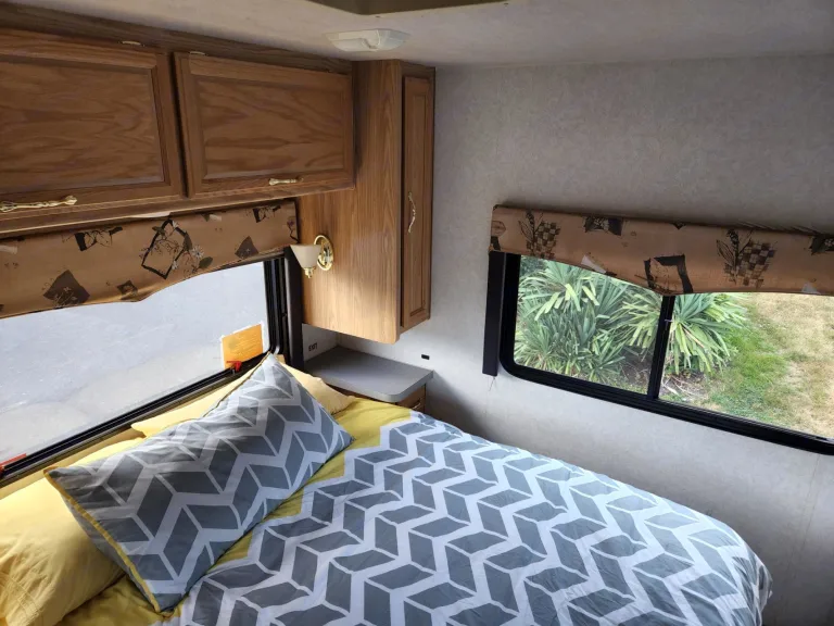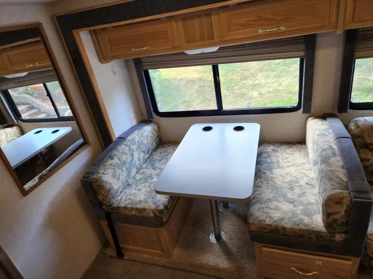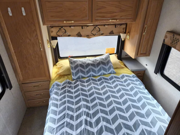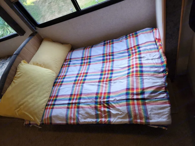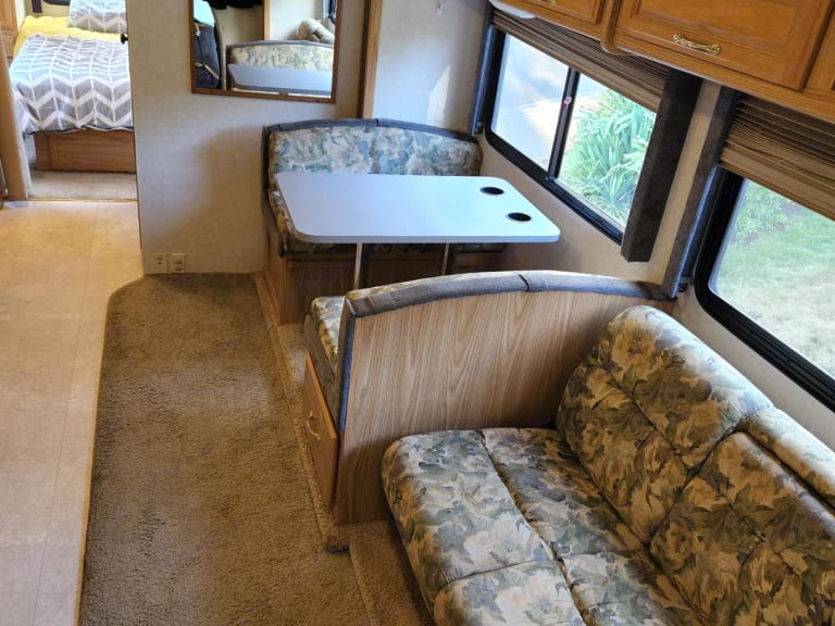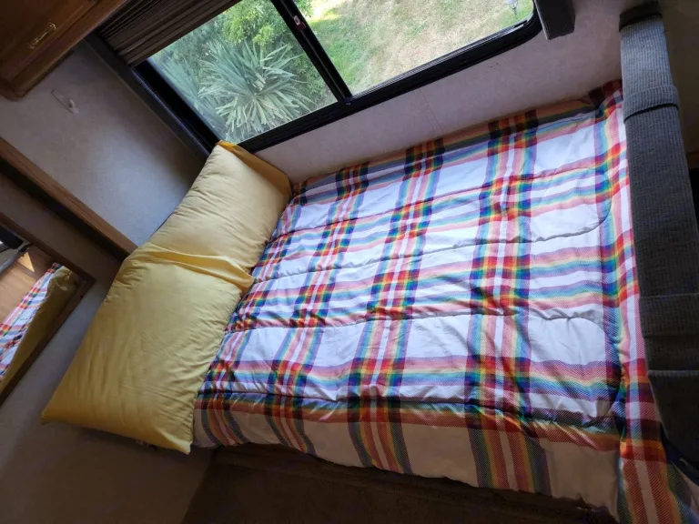 Looking for an unforgettable adventure on the road? Our trusty RV, Stevie, is ready to hit the highway and make your travels feel just like home. While Stevie has seen a few miles, her low mileage and excellent condition ensure you’ll have a smooth and reliable ride!Comfort All Year Round:Stay cool on warm days with the easy-to-use central air conditioning.Keep cozy during the cooler months with the efficient heating system.Fully Equipped Kitchen:Our kitchen has everything you need to cook up your favorite meals: pots, pans, dishes, silverware, utensils, an electric kettle, microwave, stove, oven, and refrigerator.Sleeping Arrangements:Enjoy a restful night’s sleep on the queen-sized bed in the private bedroom.The full-sized bed over the cab offers additional sleeping space for two.The couch and dining table easily convert into smaller beds, perfect for kids or extra guests.Bed linens and comforters for all 4 beds included!