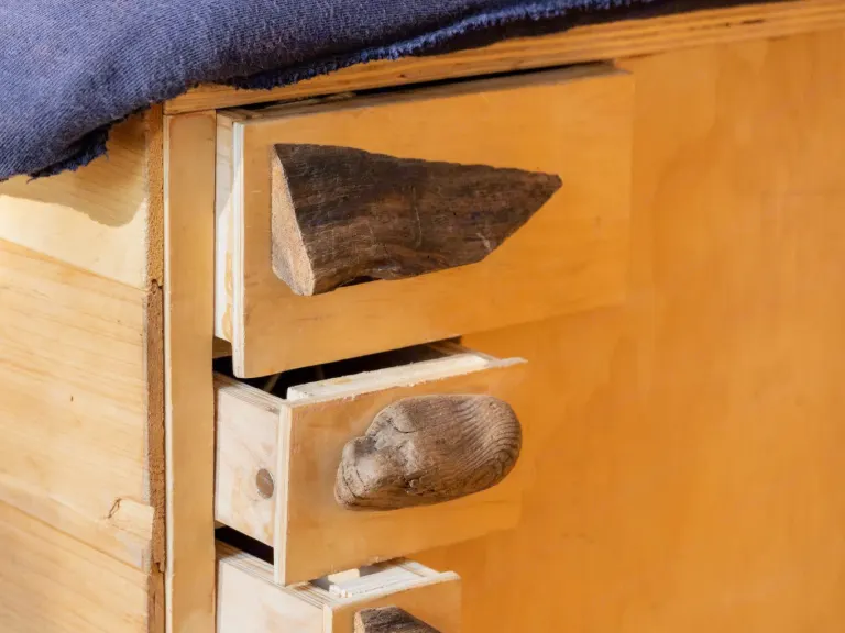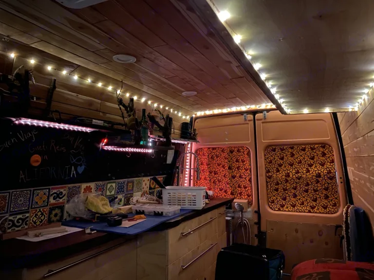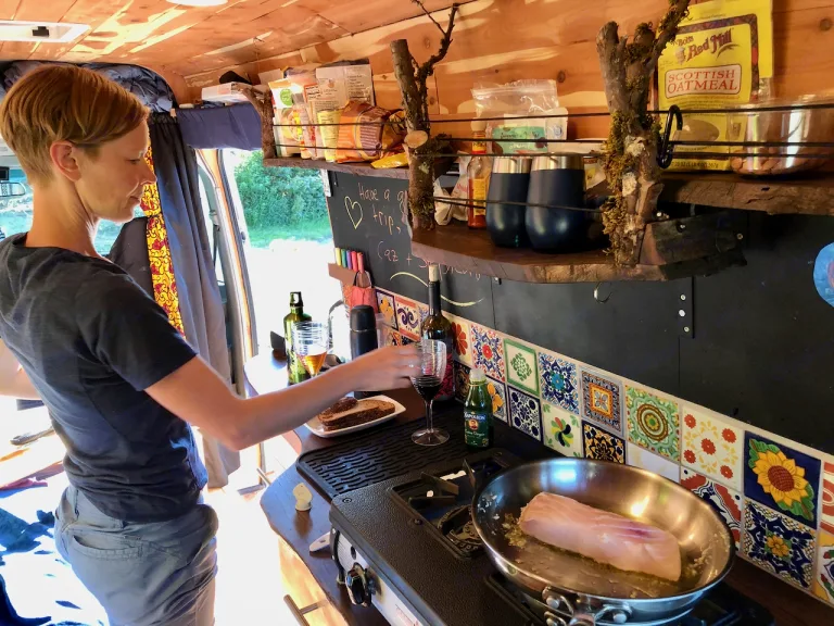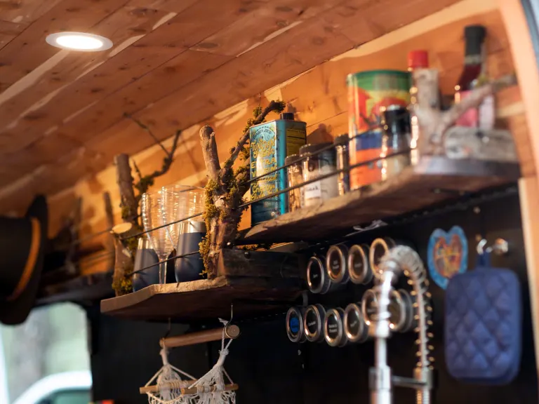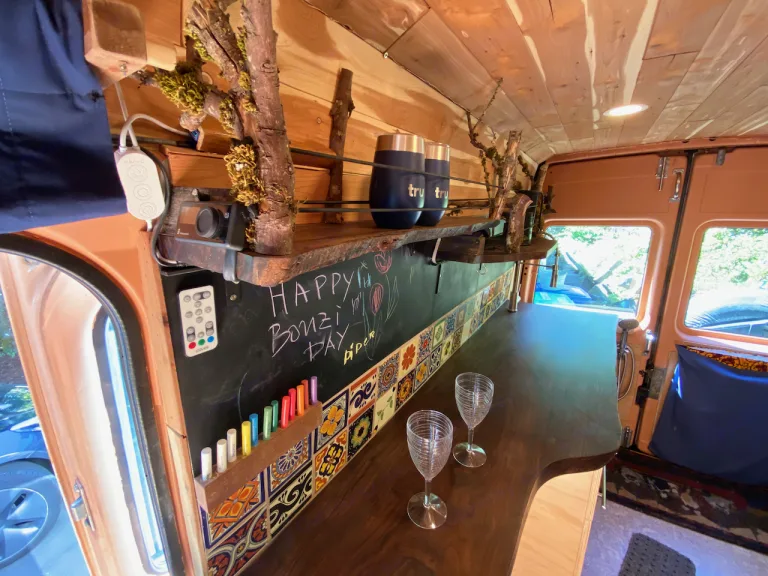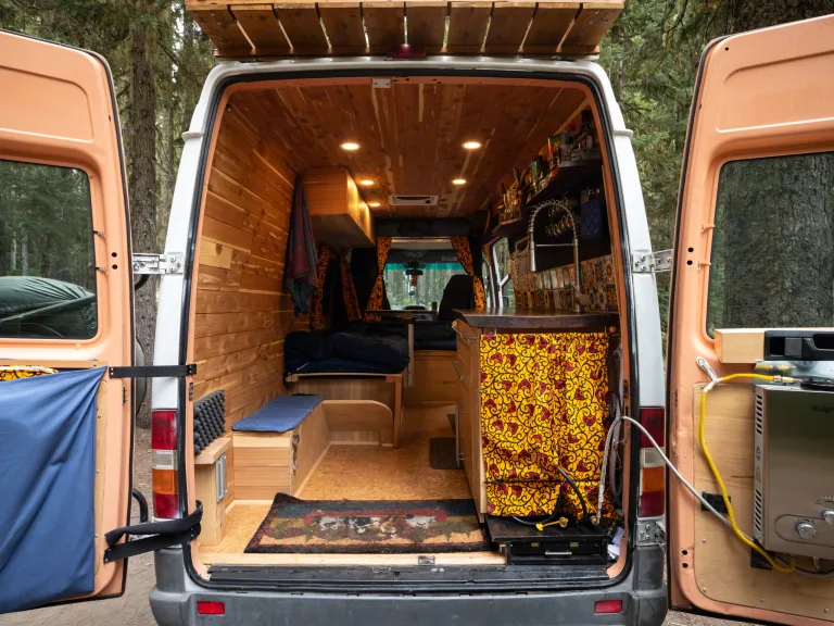 This is a high roof van so you can stand upright (up to 6’1”) to cook dinner on the double-burner gas stove with built-in propane tank. There’s a removable dinner table (walnut live-edge), a slide-out cooking platform for outdoors cooking, ample storage, lockable drawers, and even a bolted-down safe to store your valuables.