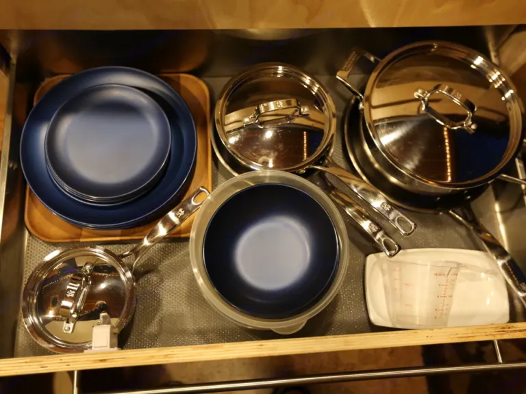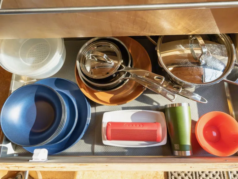 The kitchen is fully stocked with everything you could possibly need to cook up a feast. There is also a high-efficiency Dometic fridge so that your perishables stay nice and cold, and you can enjoy that lovely sunset with a drink!