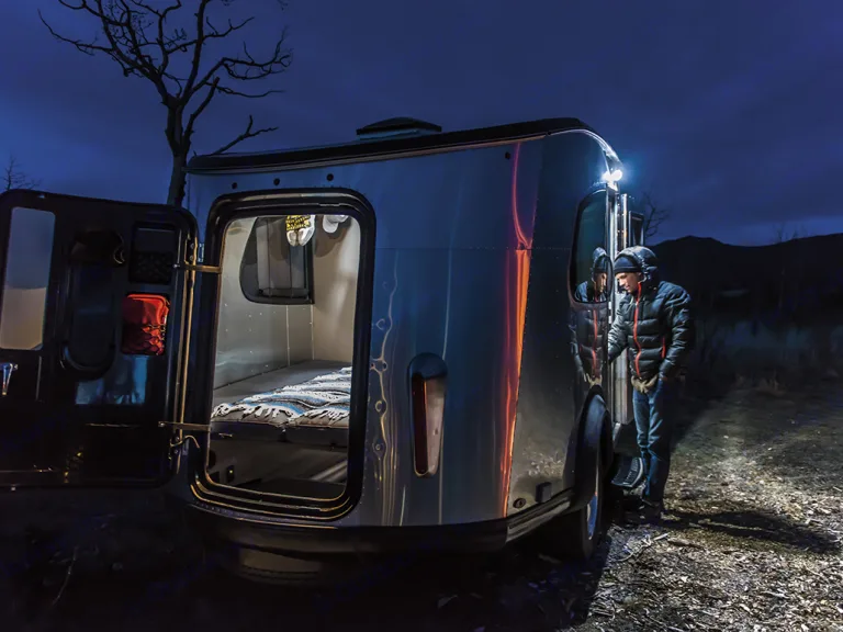 The Basecamp Travel Trailer was made for those who want to see the world. Built for adventure, it’s a small camping trailer that’s tough enough to go anywhere your wanderlust takes you, and comfortable enough to help you really enjoy the time you spend there. Head out to snowboard after the first fresh powder. Spend a week mountain biking deep in the forest. Pack up and go anywhere you please, with nothing holding you back.With a Gvwr of 3,500 lbs. this travel trailer is light enough to be pulled by most SUVs. It has solar built in, to allow for boon-docking in the most remote areas. The rear converts from a dinette, to an almost king-sized bed.What's includedBed sheets, 3 bath towels, 3 kitchen towels, silverware, plates, cups, basic cooking utensils, toilet paper, paper towels, lighter, 2 roasting sticksRecommendationsFind a camp ground for traditional camping, or take this to a remote area of your choosing and live off-grid!Other things to noteNo smokingHow-to videos: